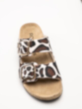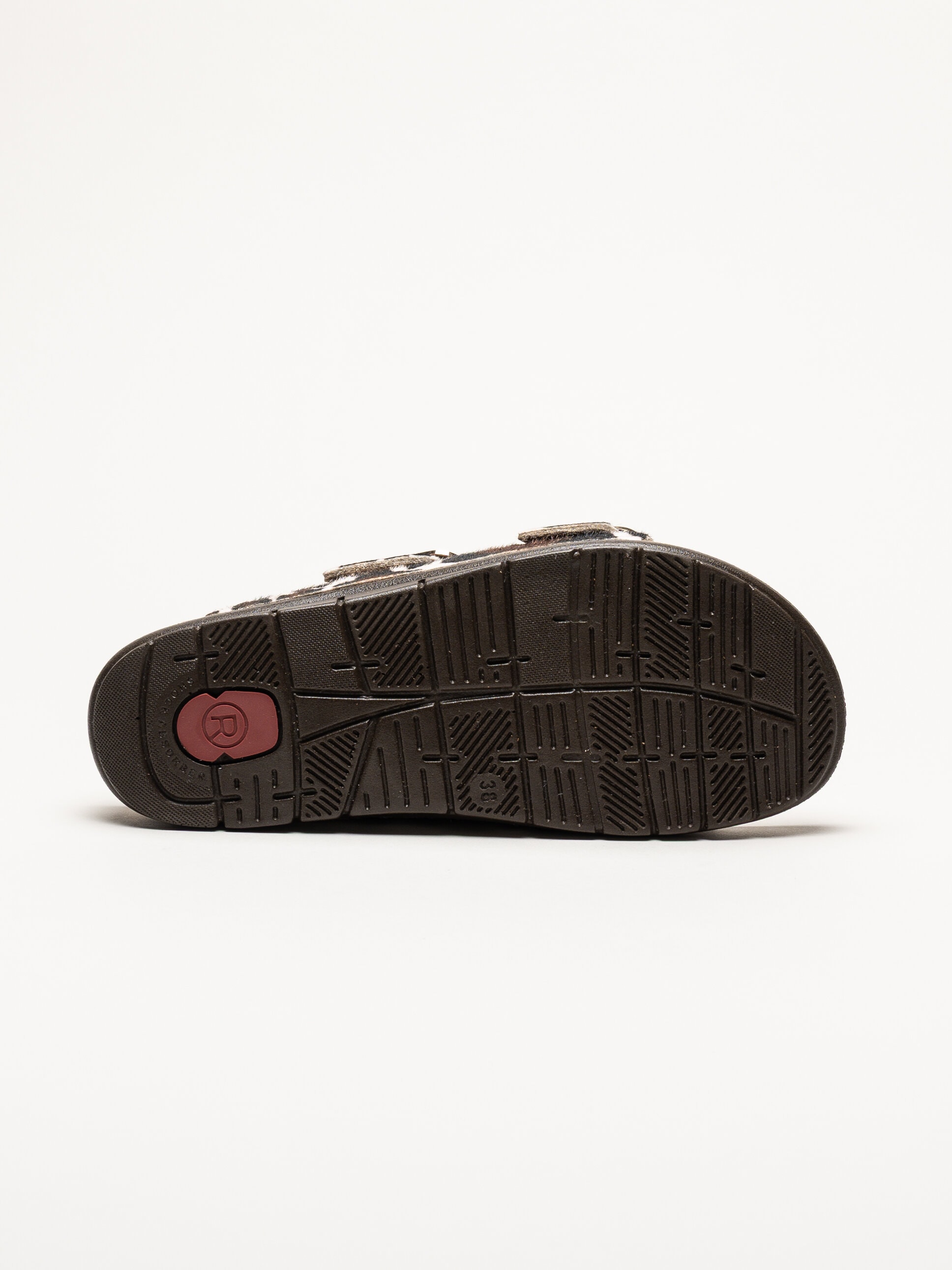 Djurmönstrade slip-in sandaler Rodigo-D från Rohde i färgen Mocca med en trendig och iögonfallande design. Ovandelen är tillverkad i textil med ett dekorativt mönster som ger ett modernt uttryck. Modellen har två justerbara remmar med guldspännen som gör det enkelt att anpassa passformen efter foten.