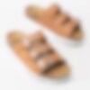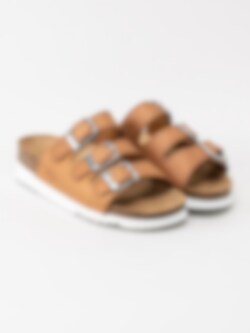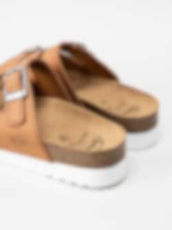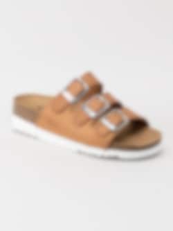 Bruna slip in sandaler Rio Wedge AD från Scholl i nubuck. Ergonomiskt formad toffel som passar bra både inom och utomhus. Tre justerbara remmar med guldfärgade spännen med logga för att få den bästa passformen. Liten präglad logga på utsidan. Brunt foder i textil och brun innersula i mocka med svart logga. Låg platå på ca 3.5 cm. Mellansula i kork med upphöjd kant. Svart yttersula i syntet med slät yta och logga. Riktigt skön bas-sandal för sköna dagar på stranden eller hemma.