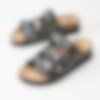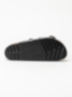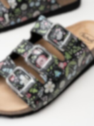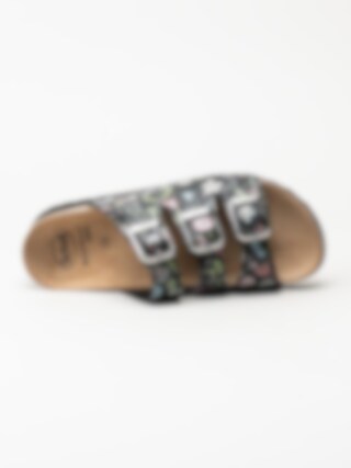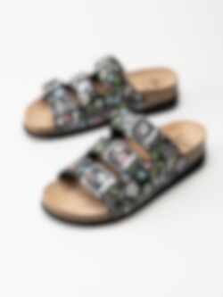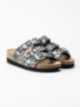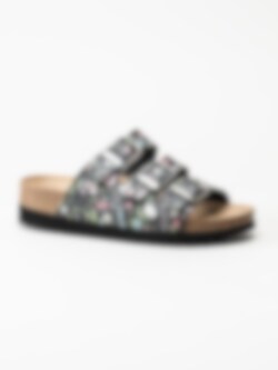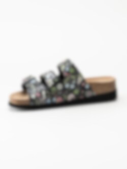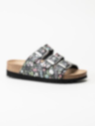 Svarta blommiga slip in sandaler från Scholl. Ergonomiskt formad toffel som passar bra både inom och utomhus. Tre justerbara remmar med silverfärgade spännen med logga för att få den bästa passformen. Liten präglad logga på utsidan. Svart foder i textil och brun innersula i mocka med svart logga. Låg platå på ca 3.5 cm. Mellansula i kork med upphöjd kant. Svart yttersula i syntet med slät yta och logga. Riktigt skön bas-sandal för sköna dagar på stranden eller hemma.