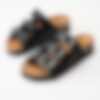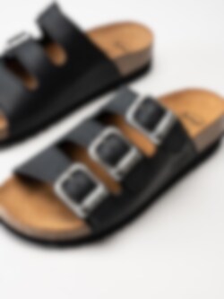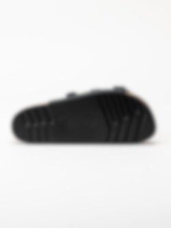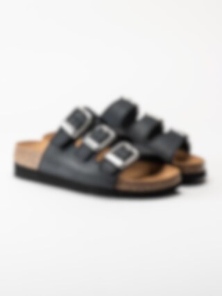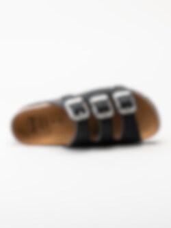 Svarta slip in sandaler Rio Wedge AD från Scholl. Ergonomiskt formad toffel som passar bra både inom- och utomhus. Tre justerbara remmar med silverfärgade spännen med logga för att få den bästa passformen. Låg platå på ca 3.5 cm. Mellansula i kork med upphöjd kant.