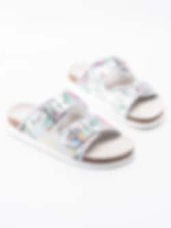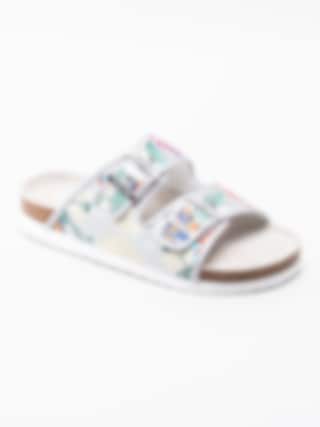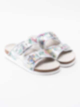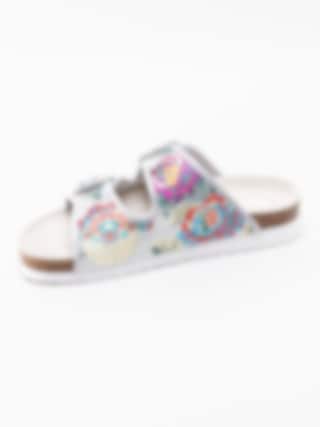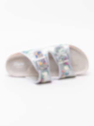 Silver slip in sandaler Thalia från Sköna Marie tillverkad i satin med dekorativa broderingar med motiv av blommor. Bred och skön modell som passar för bredare fötter. Två justerbara remmar med spänne i silver för att kunna anpassa passformen. Grått foder i textil och innersula i mocka med sömlös logga. Låg klack på ca 3 cm och platå på 2 cm. Beklädd mellansula i kork och svart yttersula i syntet med randigt mönster.