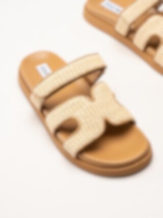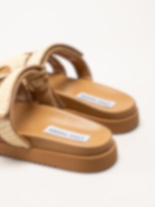 Beige sandaler Missile från Steve Madden i färgen Natural Raffia. Sandalerna har en justerbar rem över foten och en dekorativ design som ger ett stiligt intryck. Innersulan i syntet ger komfort, och de passar lika bra till stranden som till mer uppklädda tillfällen.