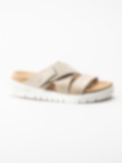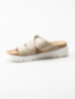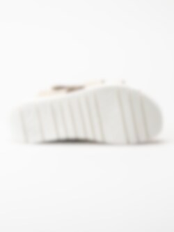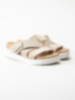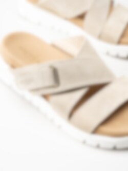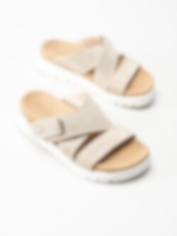 Beige slip in sandaler i mocka från Sweeks. Snygga slip in remsandaler med en justerbar rem. Foder i skinn och innersula i textil. Vit grov yttersula i gummi.