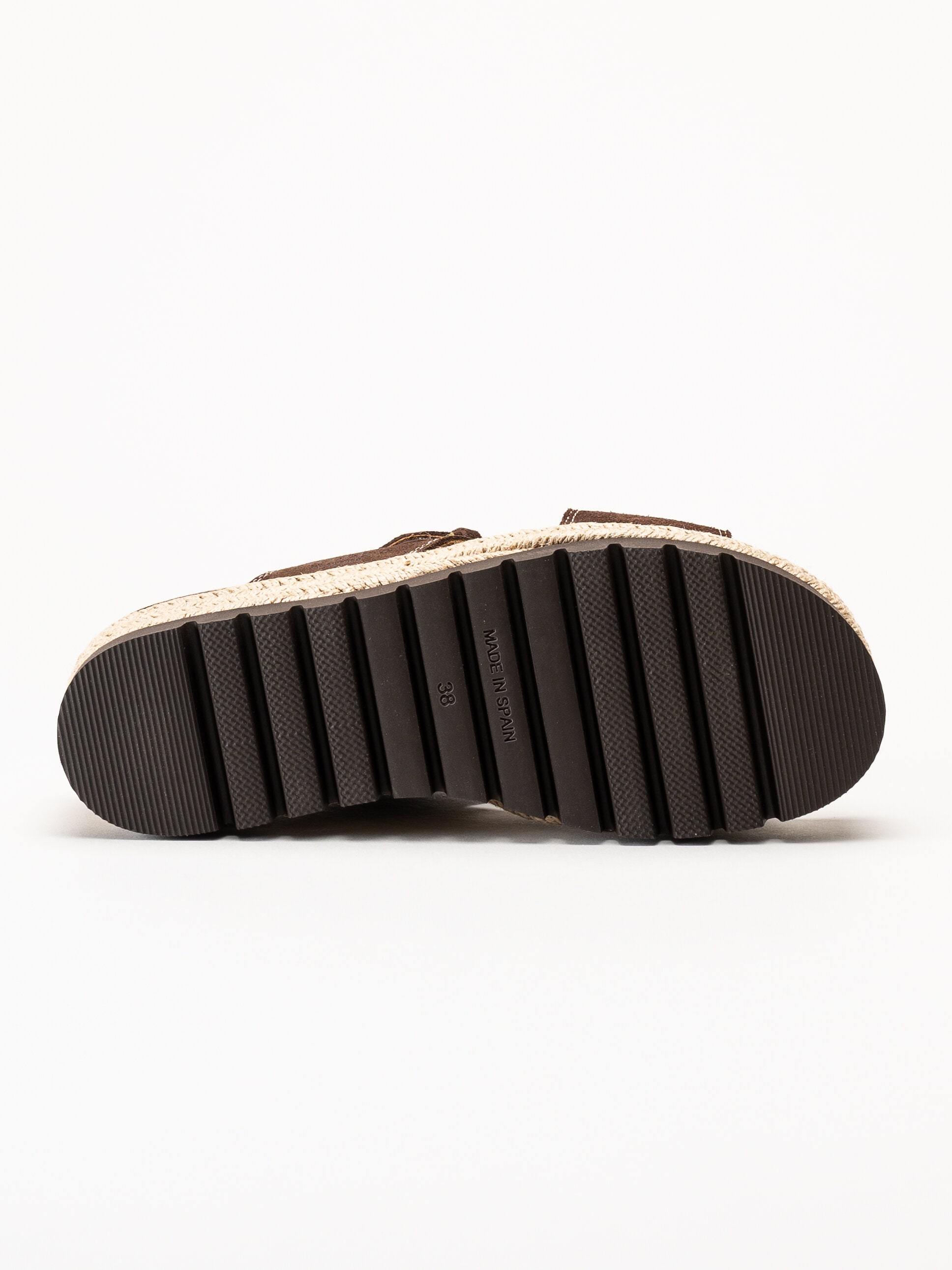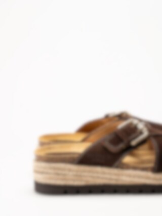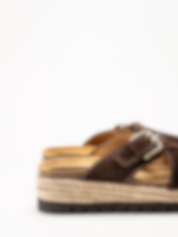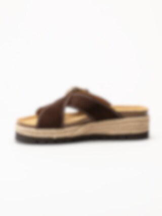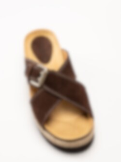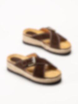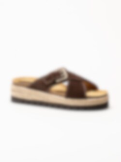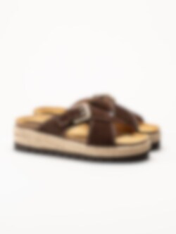 Mörkbruna sandaler i mocka Sonja Cross från Sweeks med en stilren och somrig design. Ovandelen är tillverkad i mjuk mocka som ger ett följsamt och elegant uttryck. Modellen har korslagda remmar över foten samt ett justerbart spänne som gör det enkelt att anpassa passformen. Platåsulan ger en lätt höjd och bidrar till en bekväm och stabil gång.
