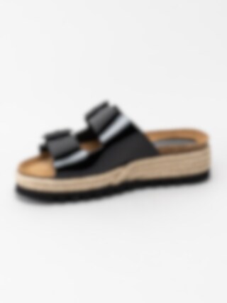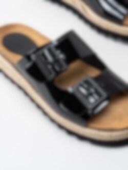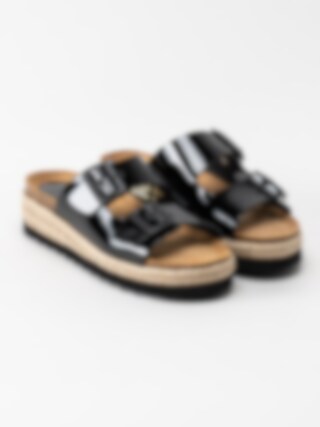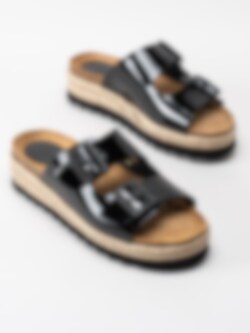 Svarta slip in sandaler Sonja från Sweeks i lack. Snygga trendiga slip in tofflor med repklädd mellansula som en snygg touch. Två, stora svarta spännen i metall och öljetter för att du ska kunna justera passformen. Präglad logotyp på utsidan. Ofodrade sandaler med mockaklädd vadderad innersula för en mjuk och skön komfort. Kilklack på ca 4.5 cm och platå på ca 3.5 cm. Svart vågig yttersula i ett syntetiskt material som är lätt och stötdämpande. Sommarens hetaste slip in sandaler, snyggt både till klänningen på festen eller shortsen till stranden.