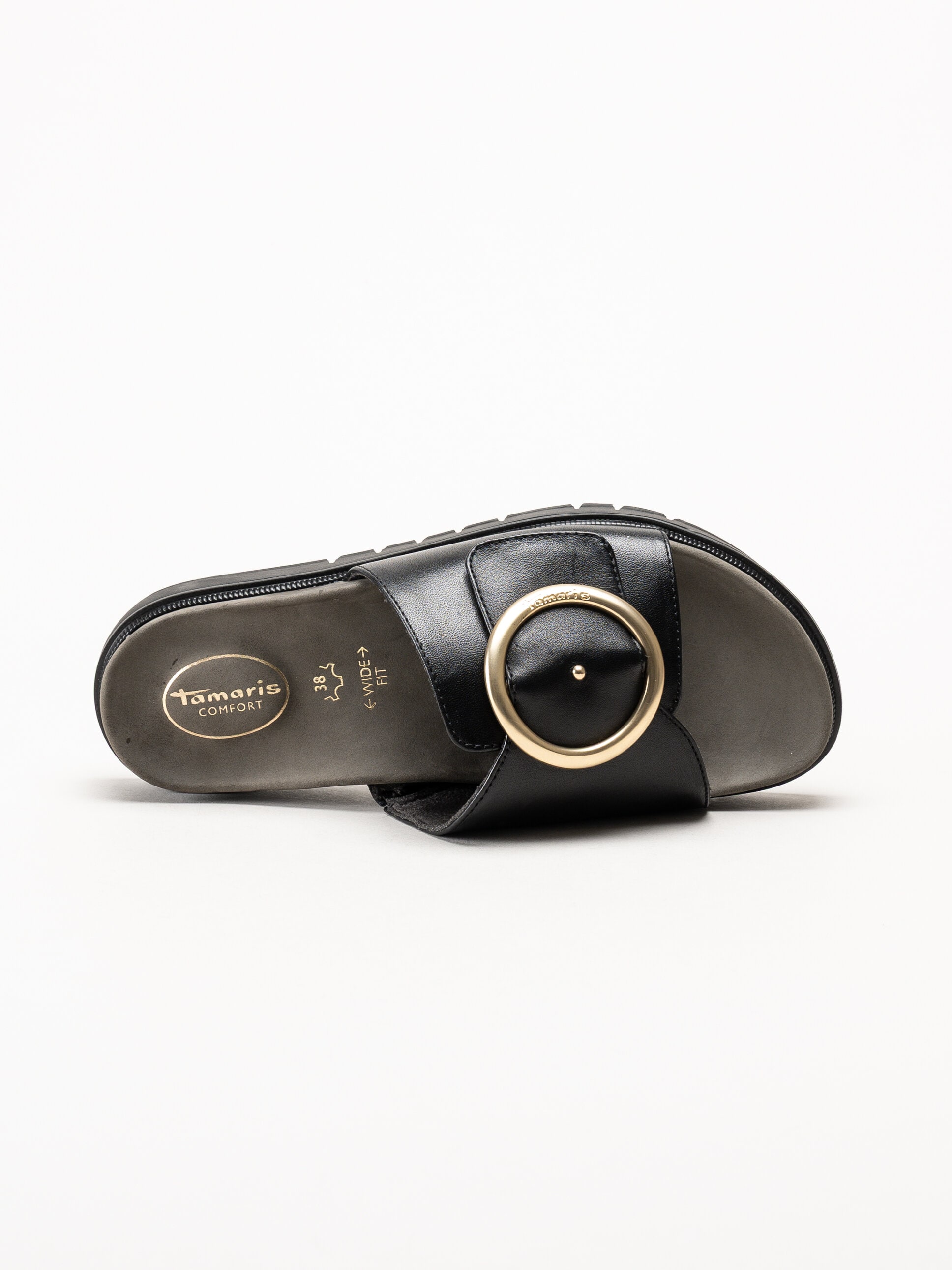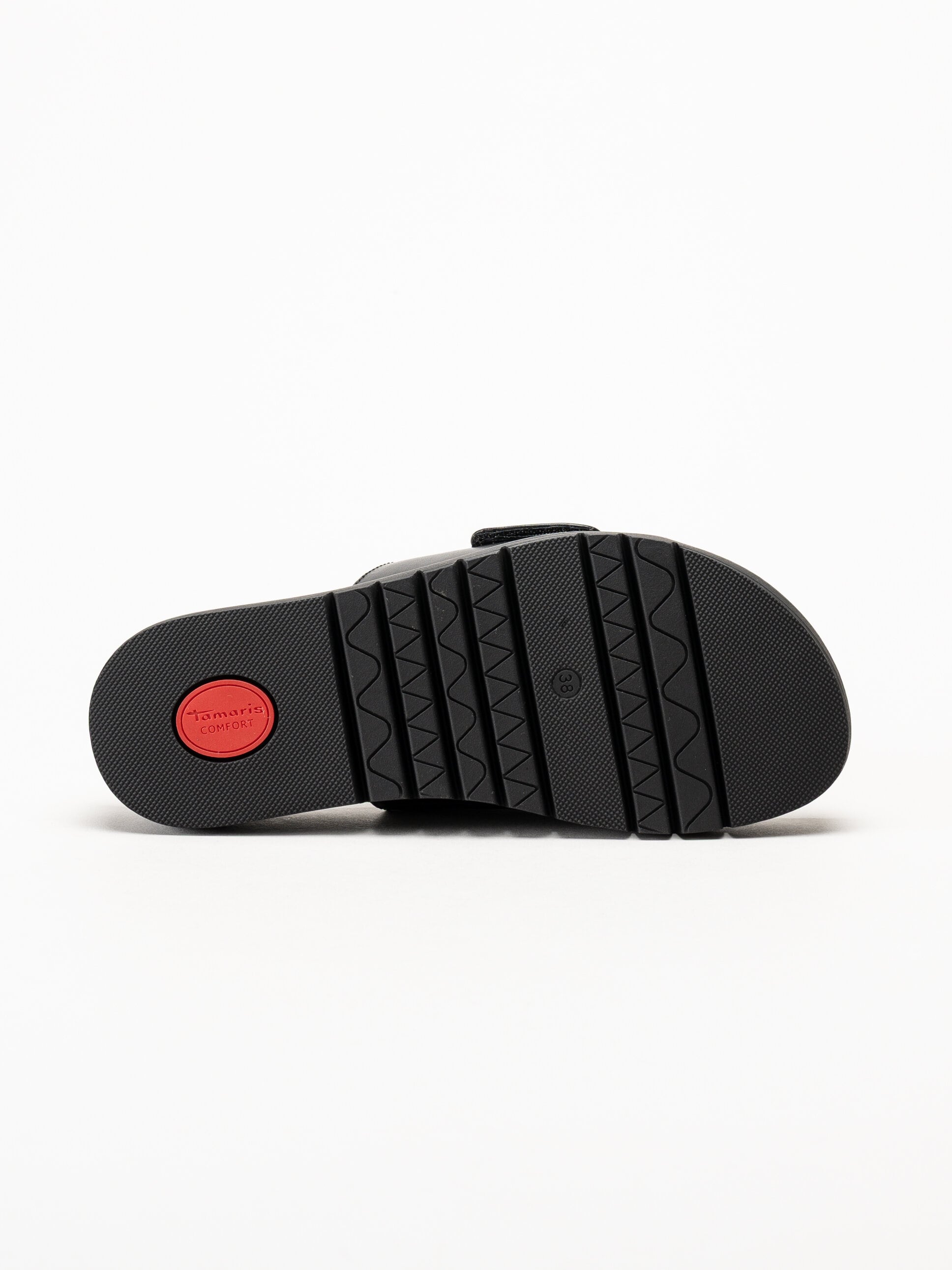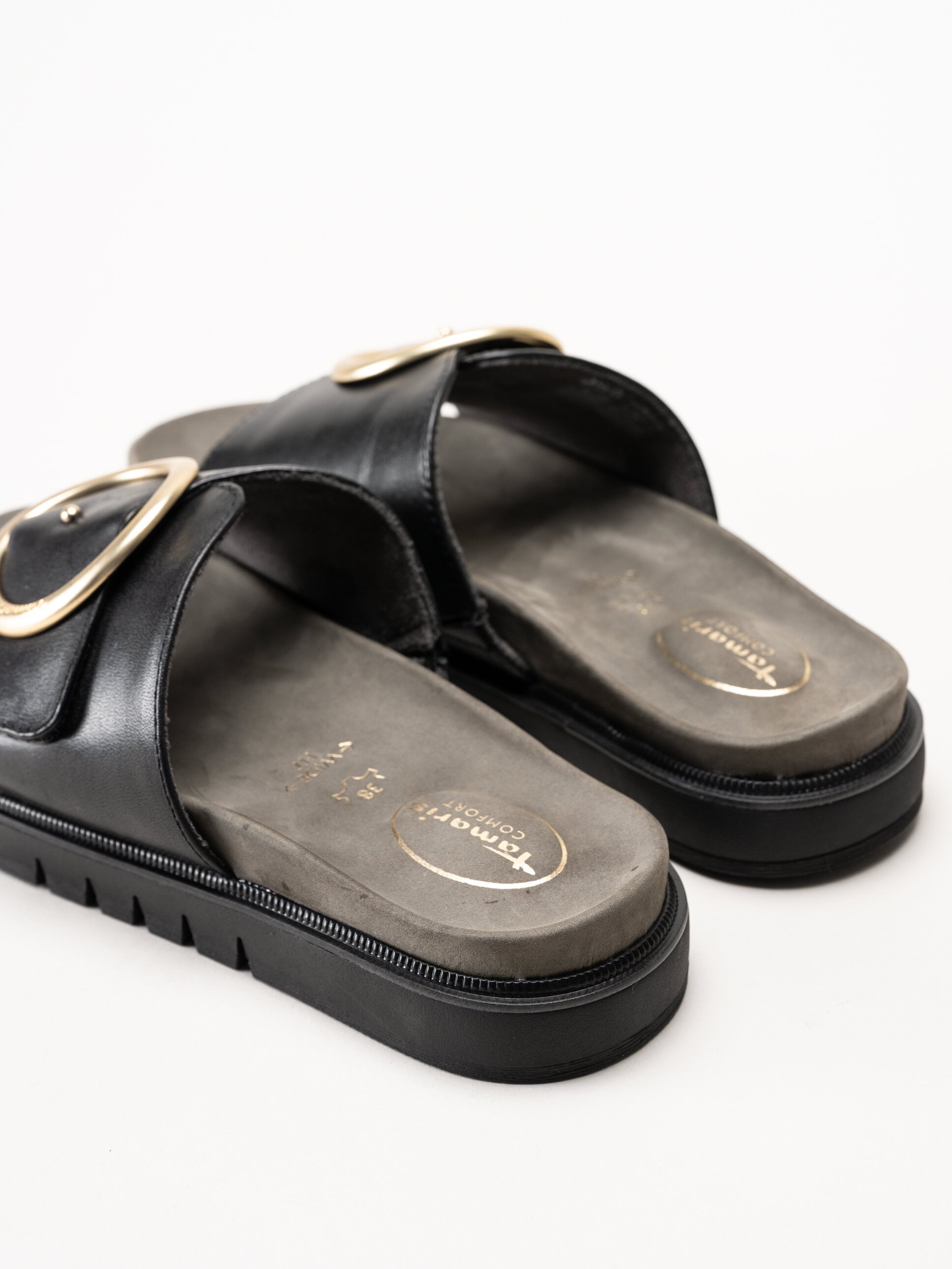 Svarta sandaler i skinn i färgen Black Nappa från Tamaris. Sandalerna är tillverkade i mjukt och följsamt skinn som ger ett stilrent och tidlöst intryck, perfekt för både vardag och sommarens lediga tillfällen. Med Tamaris Wide Fit erbjuder sandalerna extra utrymme och en bekväm passform för bredare fötter. Invändigt är modellen fodrad med textil för en behaglig känsla mot foten, och innersulan i skinn ger hög komfort och mjuk dämpning under hela dagen.