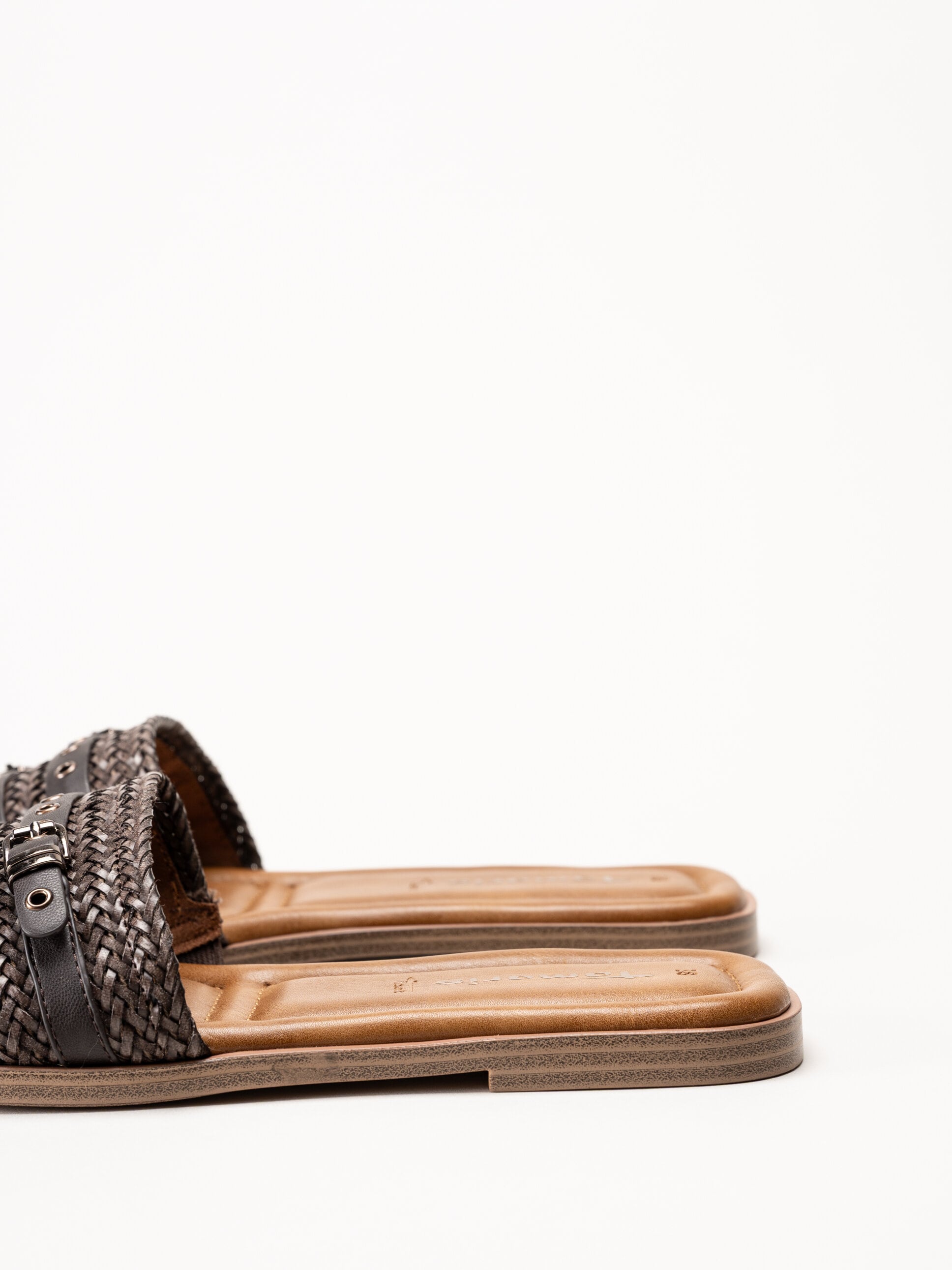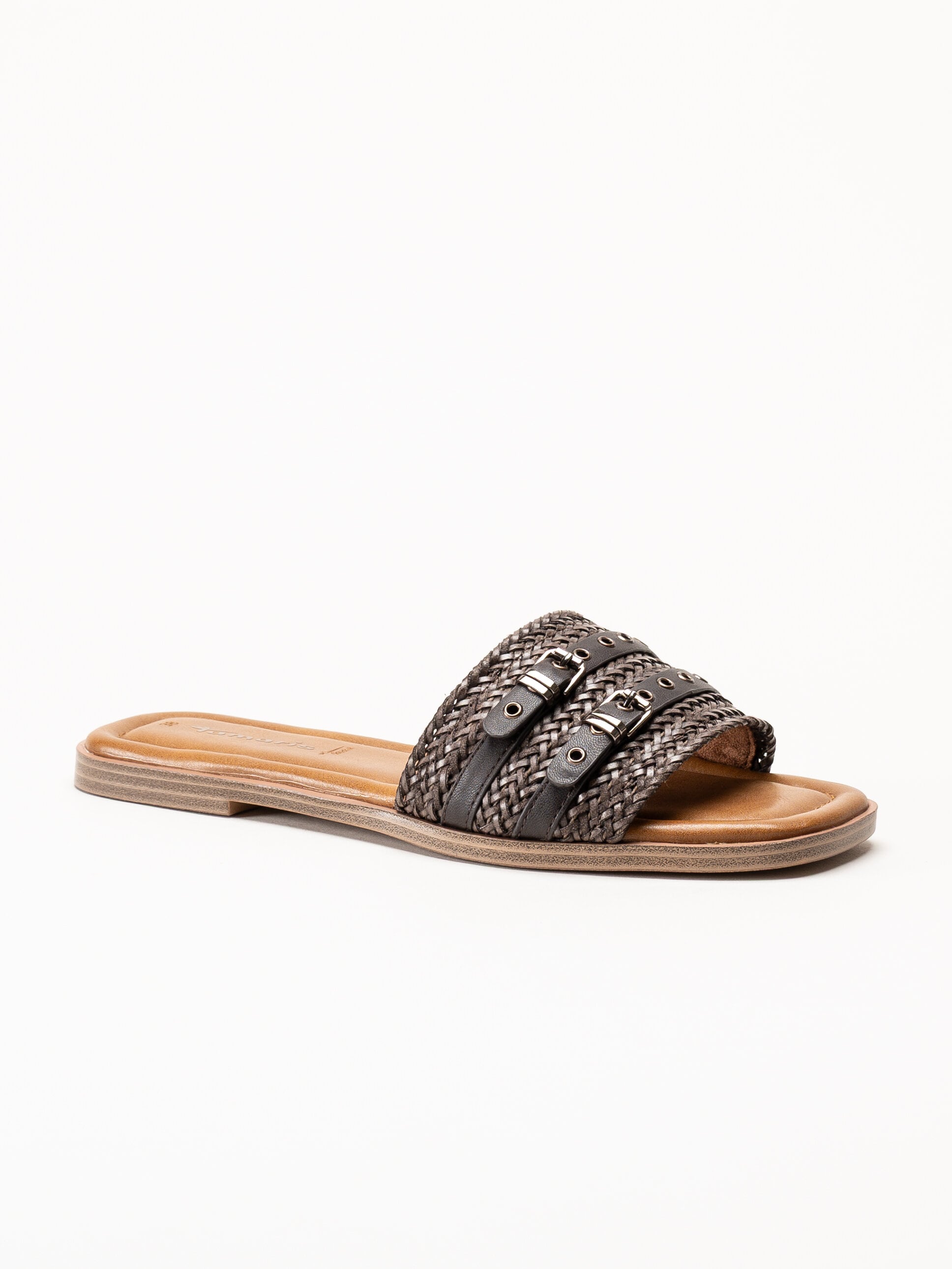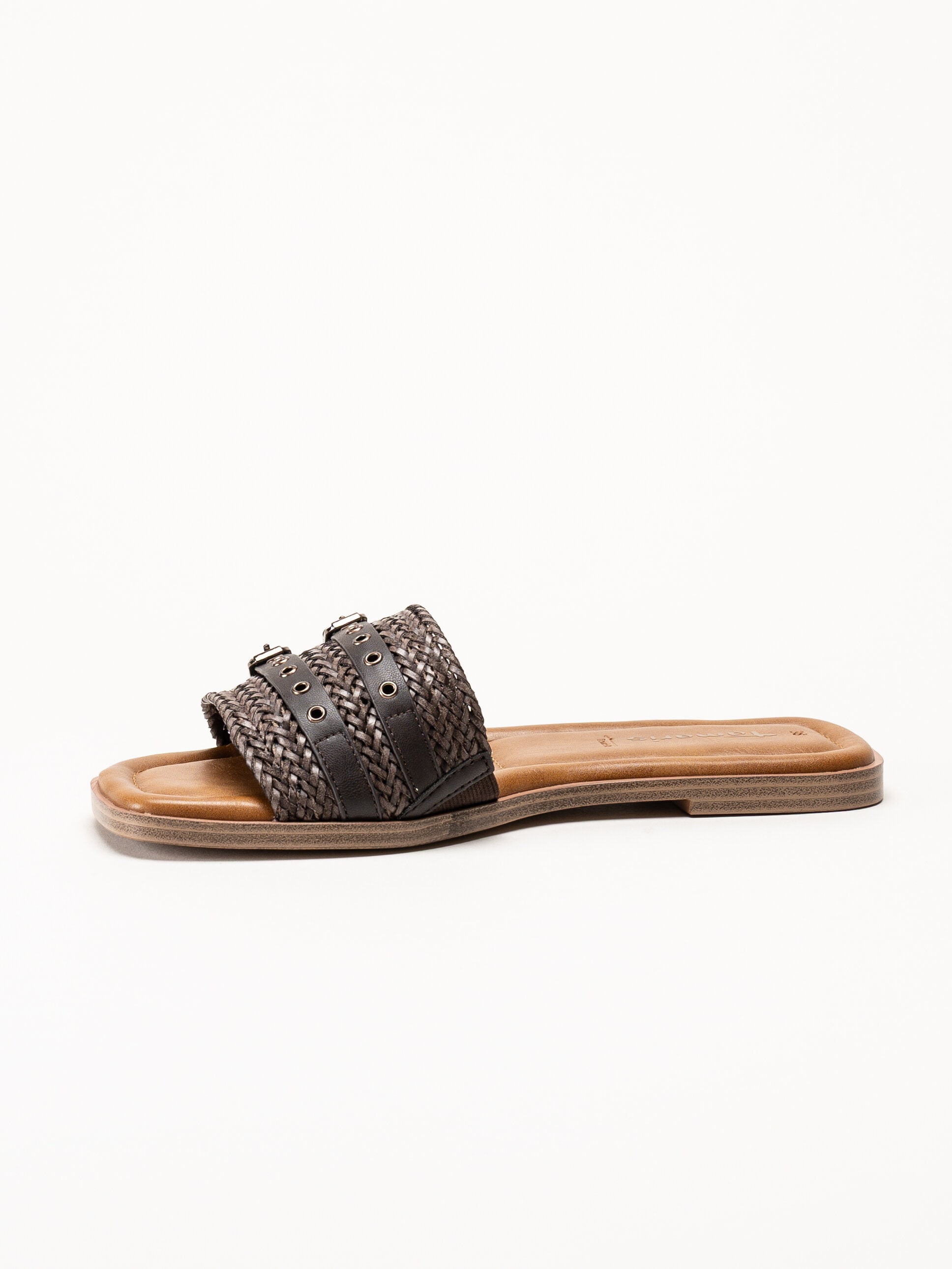 Mörkbruna slip-in sandaler från Tamaris i färgen Mocca med en stilren och somrig design. Ovandelen är tillverkad i en kombination av textil och syntet och har två dekorativa remmar med spännen som ger ett elegant uttryck.