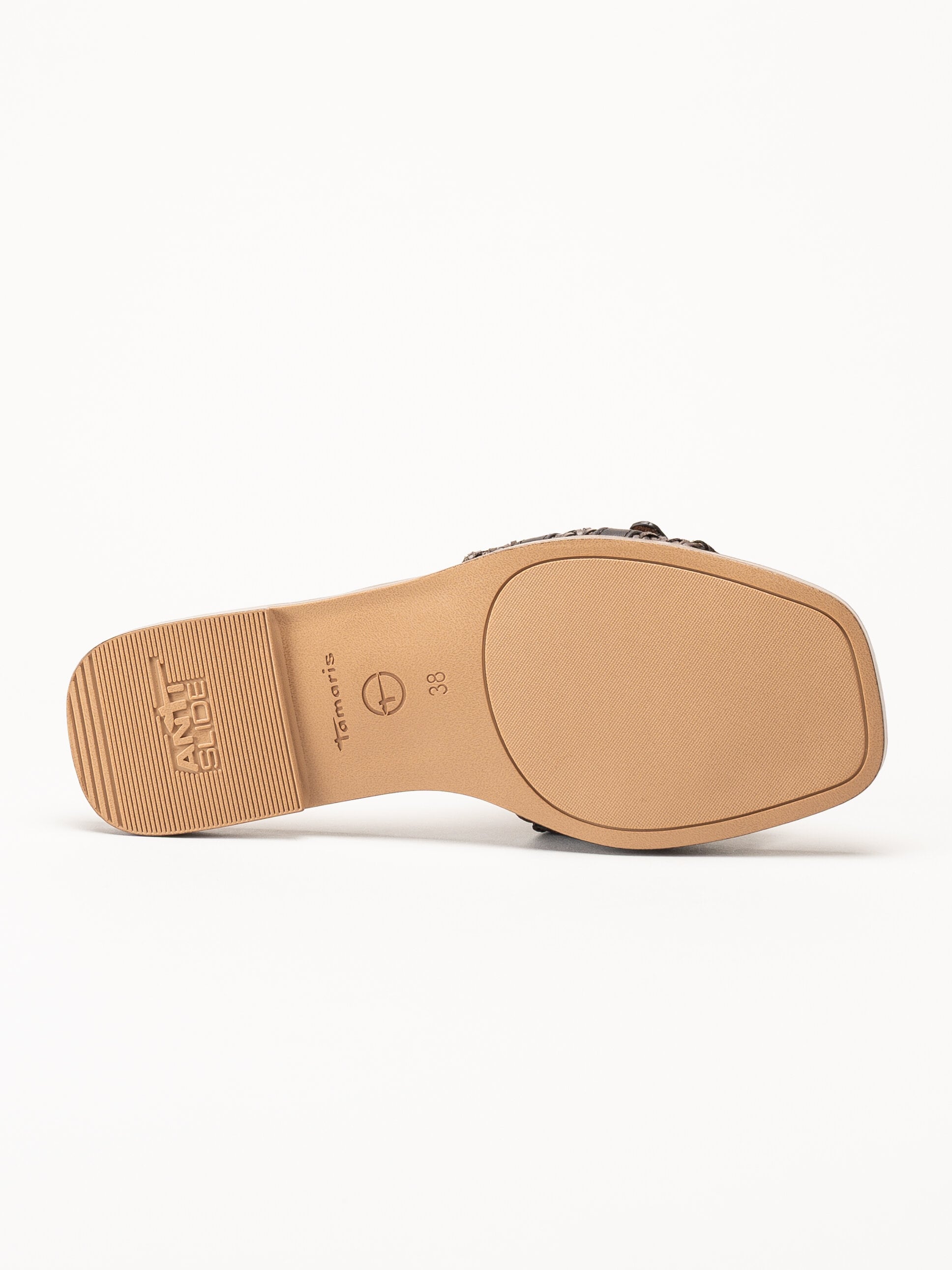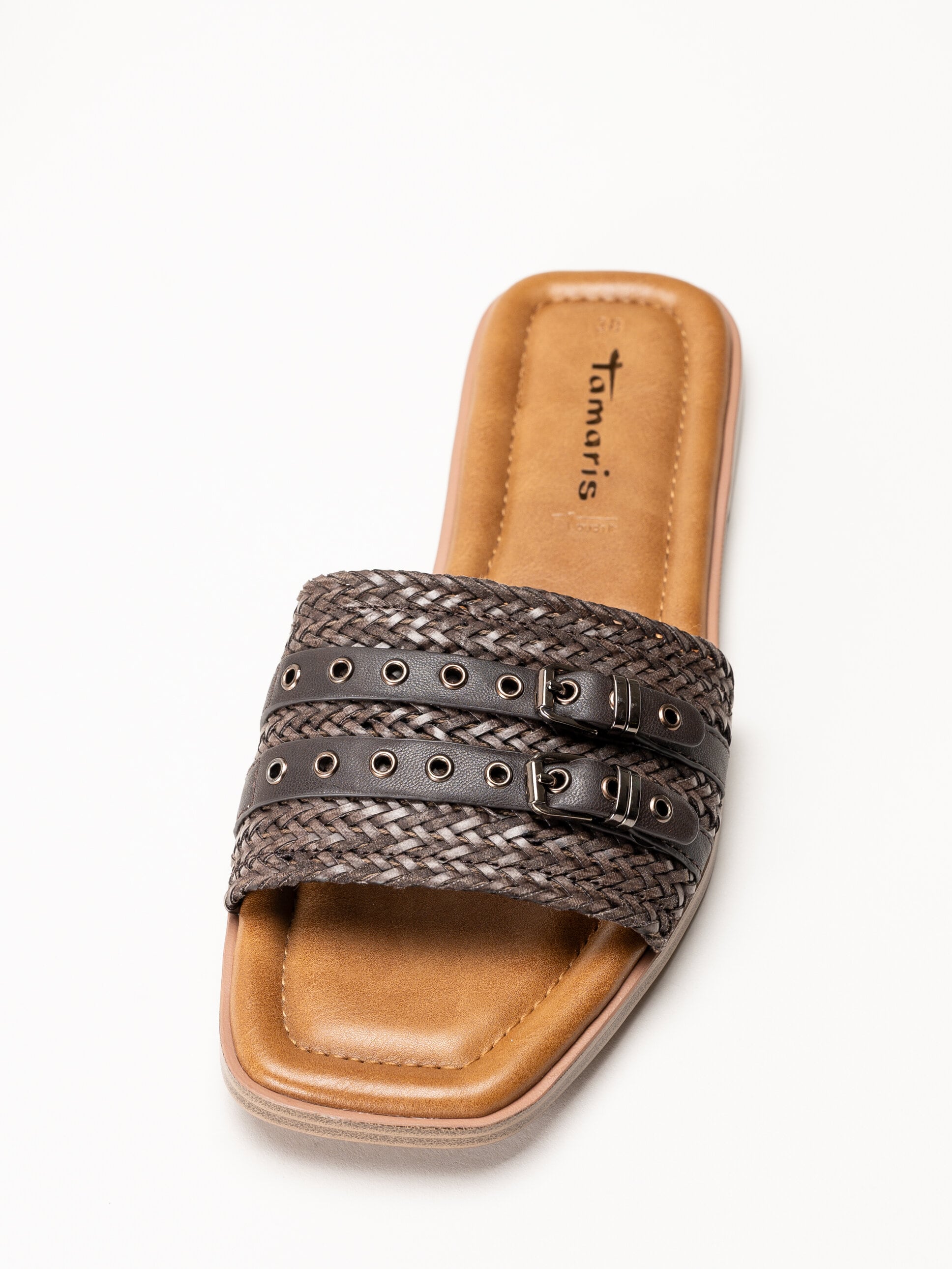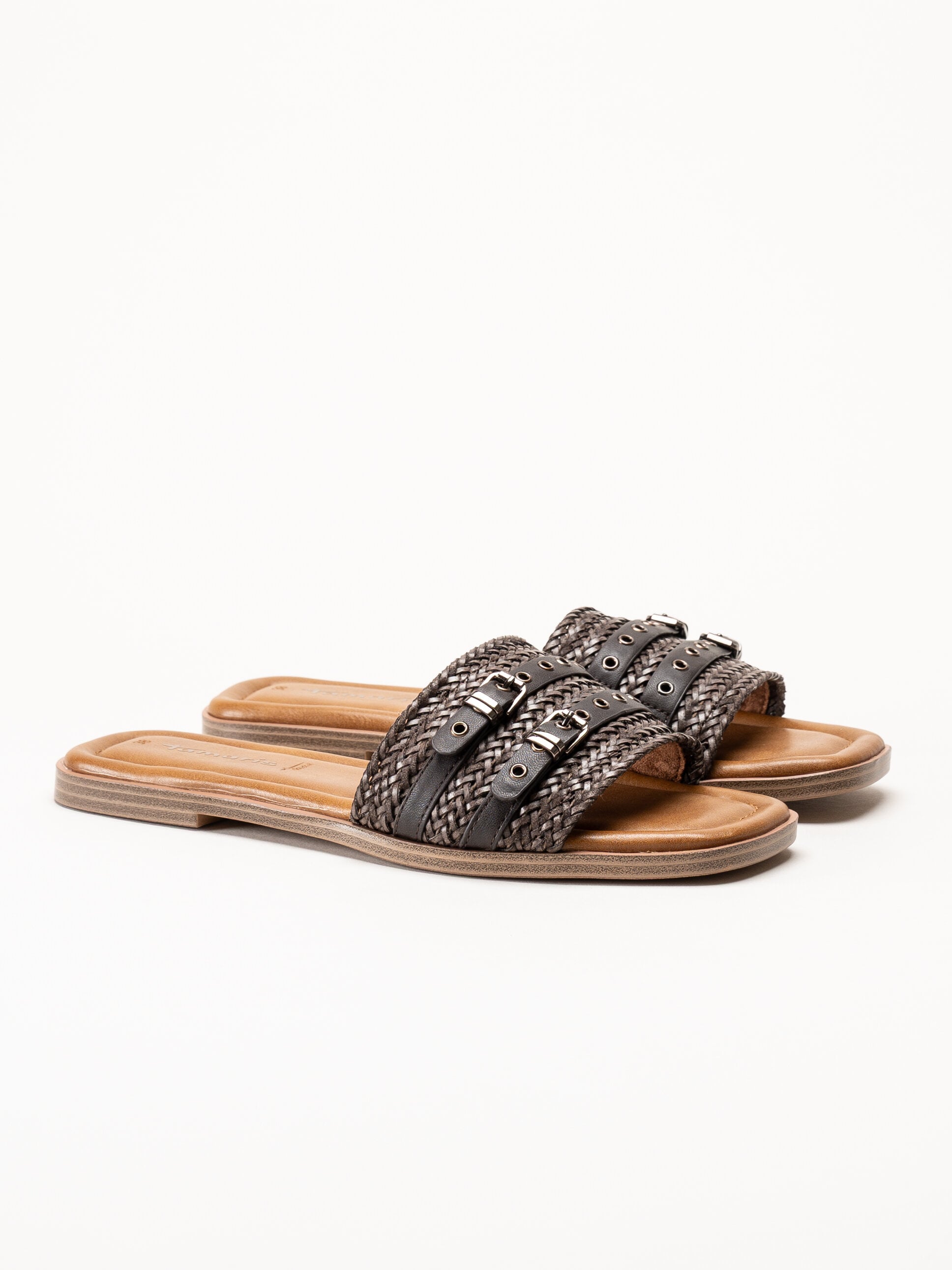 Mörkbruna slip-in sandaler från Tamaris i färgen Mocca med en stilren och somrig design. Ovandelen är tillverkad i en kombination av textil och syntet och har två dekorativa remmar med spännen som ger ett elegant uttryck.