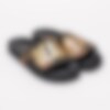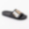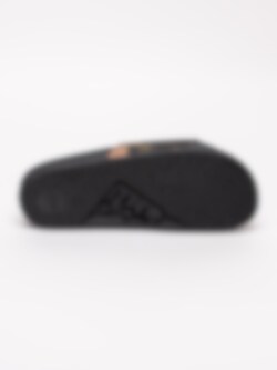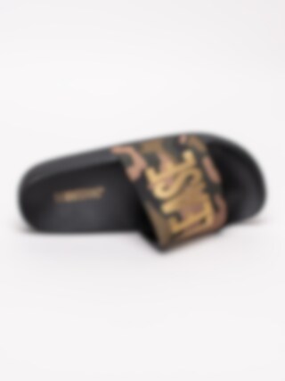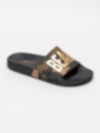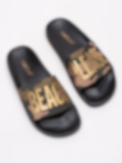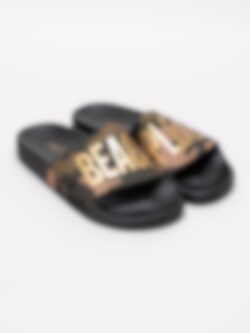 Mörkgröna kamouflage slip ins badsandaler Beach Pleace från The White Brand tillverkade i textil med guldskimrande Beach Please print på ovandel. Svart foder i textil och innersula i syntet med sömlös logga i hälen. Svart yttersula i syntet med prickigt mönster och konturerad logga.