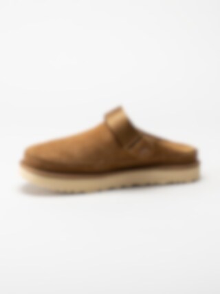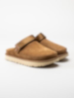 Slip in sandaler W Goldenstar Clog Chestnut i mocka från UGG. Riktigt coola clogs i sammetslen mocka och en plattformssula gjord av SugarSole™. Textilfoder tillverkat av 100% återvunna polyester och EVA formad fotbädd för hög komfort. Justerbar hälrem med stängning av kardborre. En trendig modell som kan kombineras med många stilar!