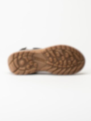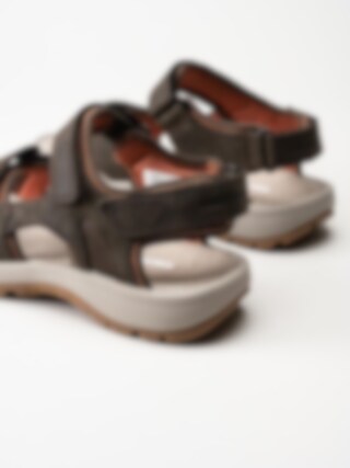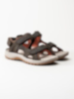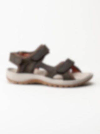 Mörkbruna sandaler i skinn från Merrell. Ett par sköna remsandaler med tre justerbara remmar och orangea detaljer. Foder och innersula av textil. Ljusbrun yttersula av gummi.