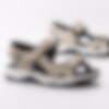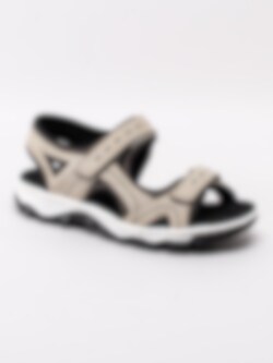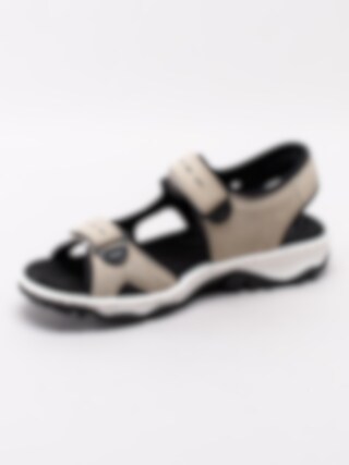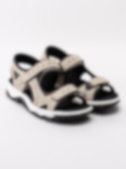 Beige sportiga sandaler från Rieker i syntetiskt läder och svart, mjuk neopren. Sköna promenadsandaler som du enkelt justerar till individuell passform med kardborreknäppningen. Beige sicksack-söm längs kanterna som detalj. Insida och innersula i textil. Vit mellansula med söm längs sulkant. Svart mönstrad yttersula i gummi med röd konturerad logotyp i mitten.