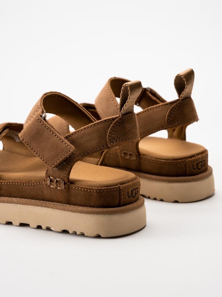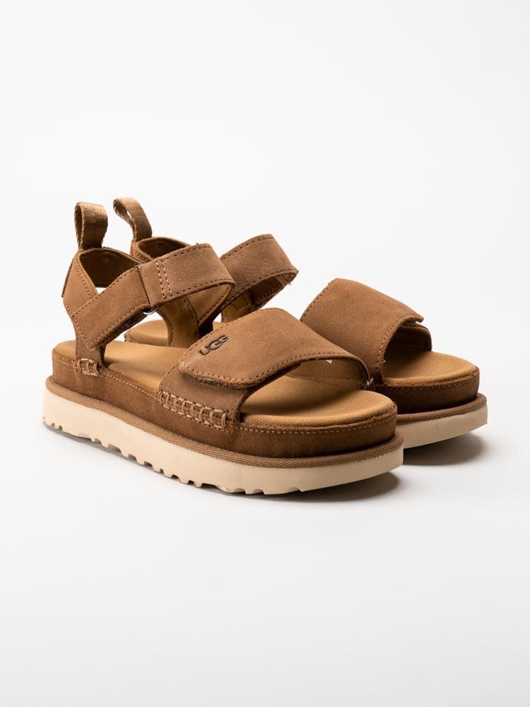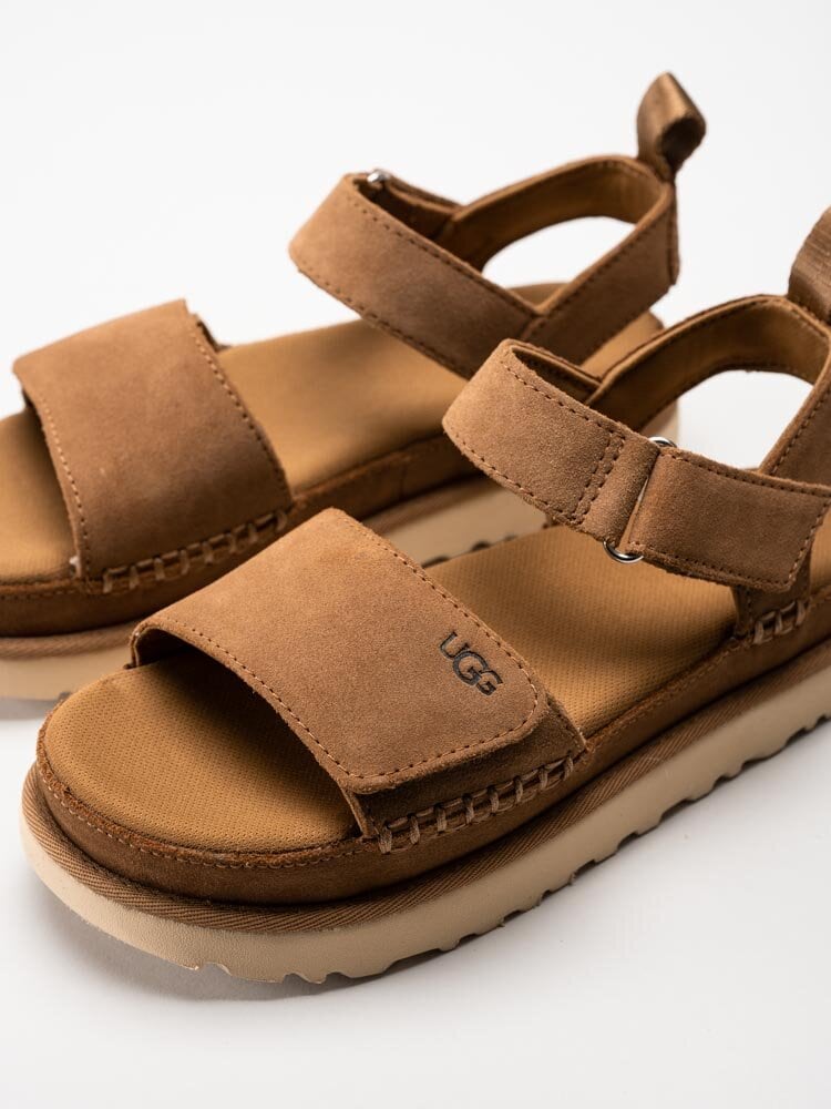 Bruna platåsandaler i mocka W Goldenstar från UGG i färgen Chestnut. Skorna är tillverkade i sammetsmjuk mocka som ger ett trendigt och elegant uttryck, med en modern platåsula som både ger höjd och komfort.