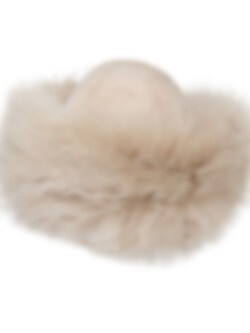 Hatten är tillverkad i mjukt fårskinn och pryds av en bred kant i långhårig, naturlig fårskinn, en kombination som förenar exklusiv känsla med omsorgsfull värme.