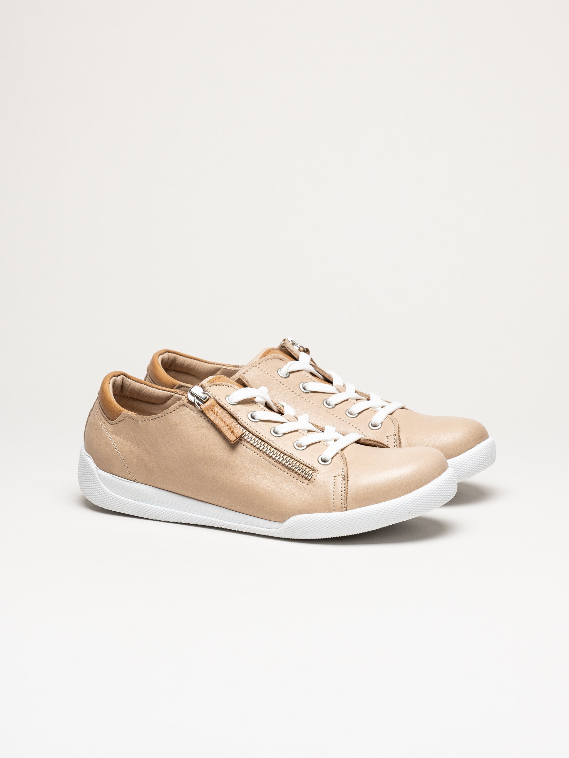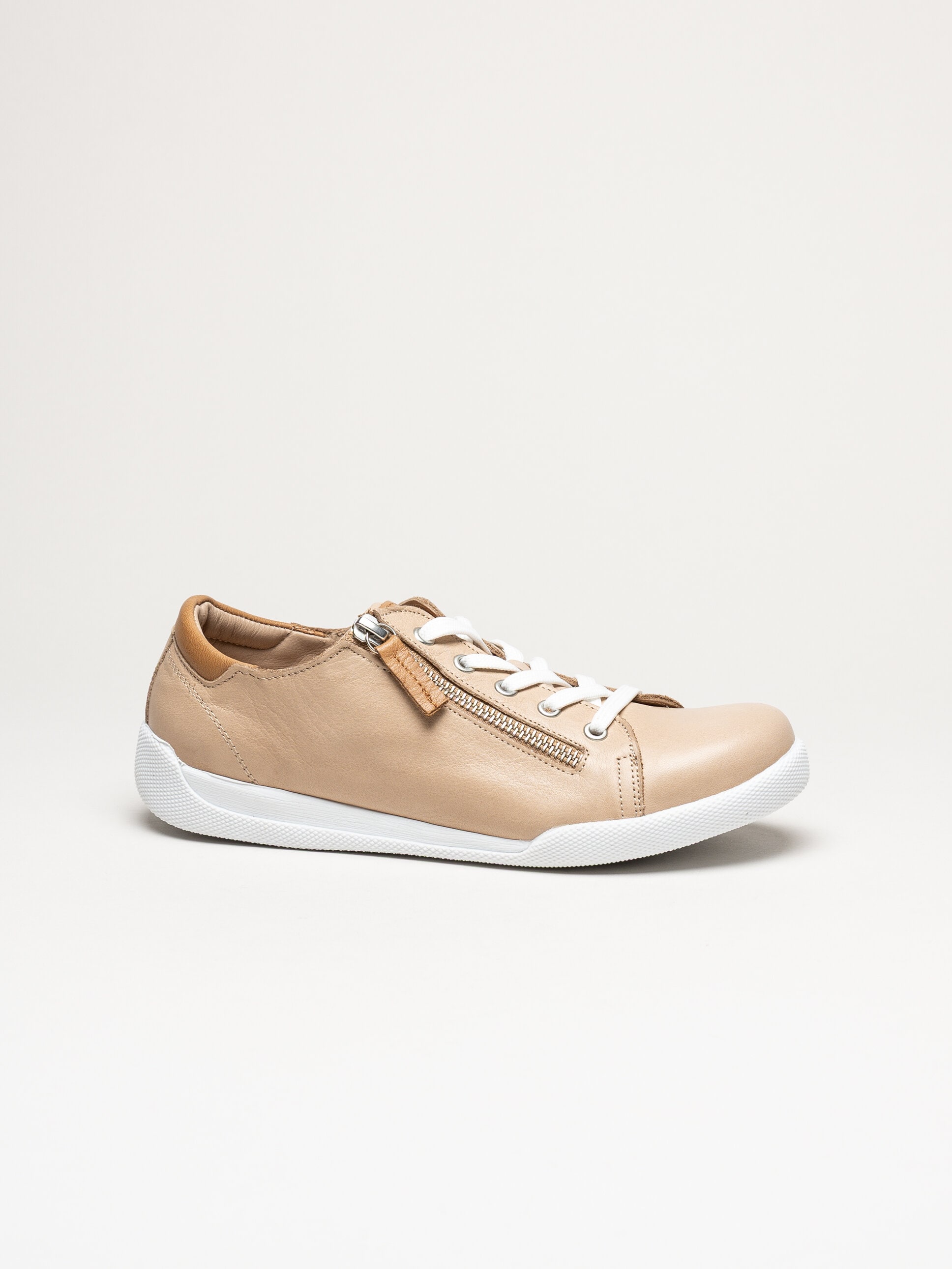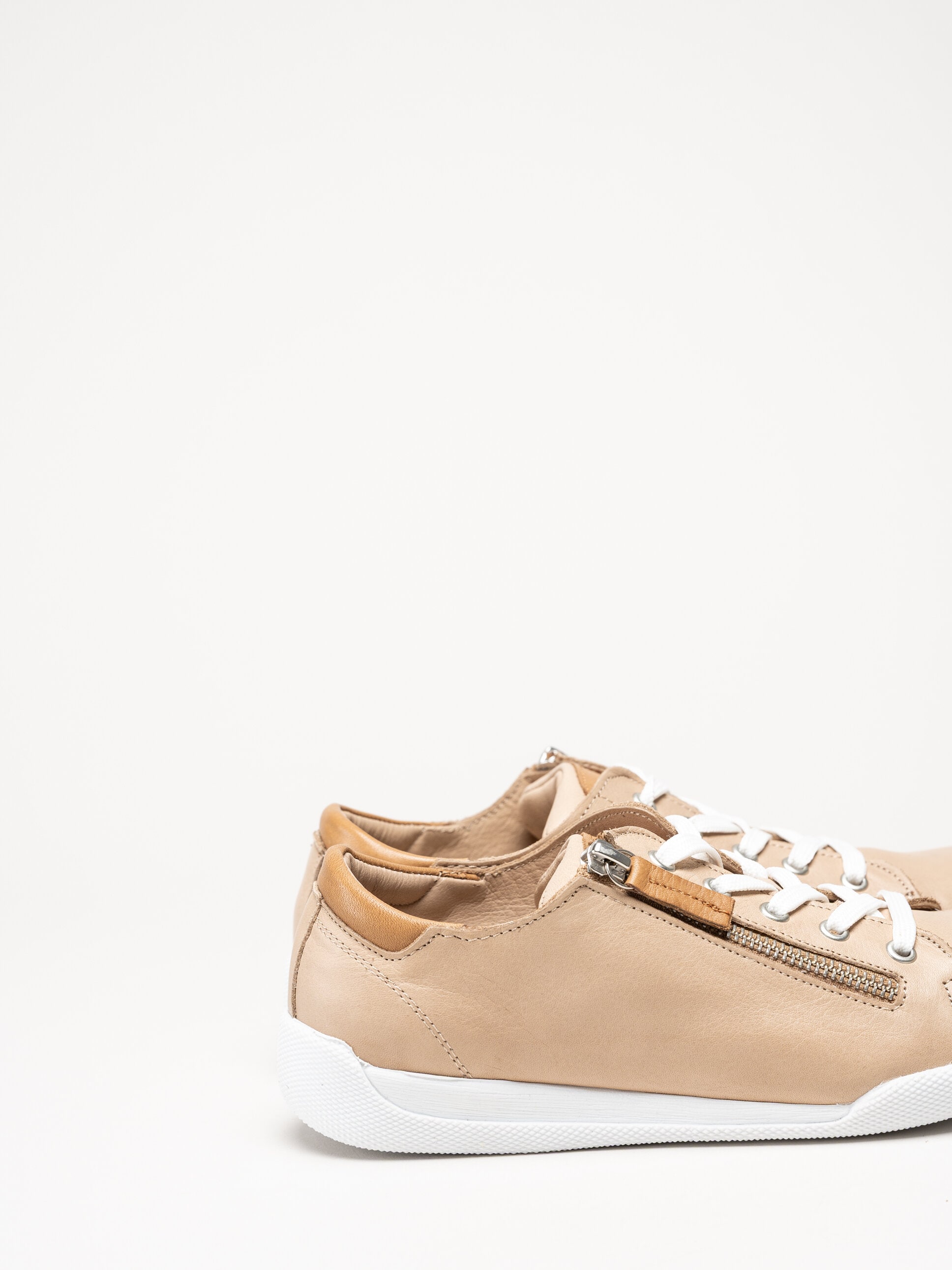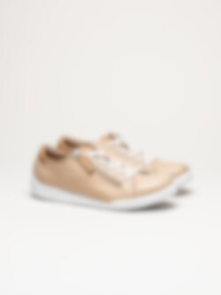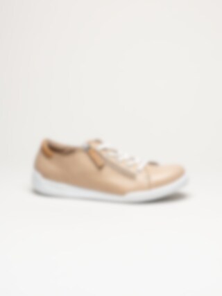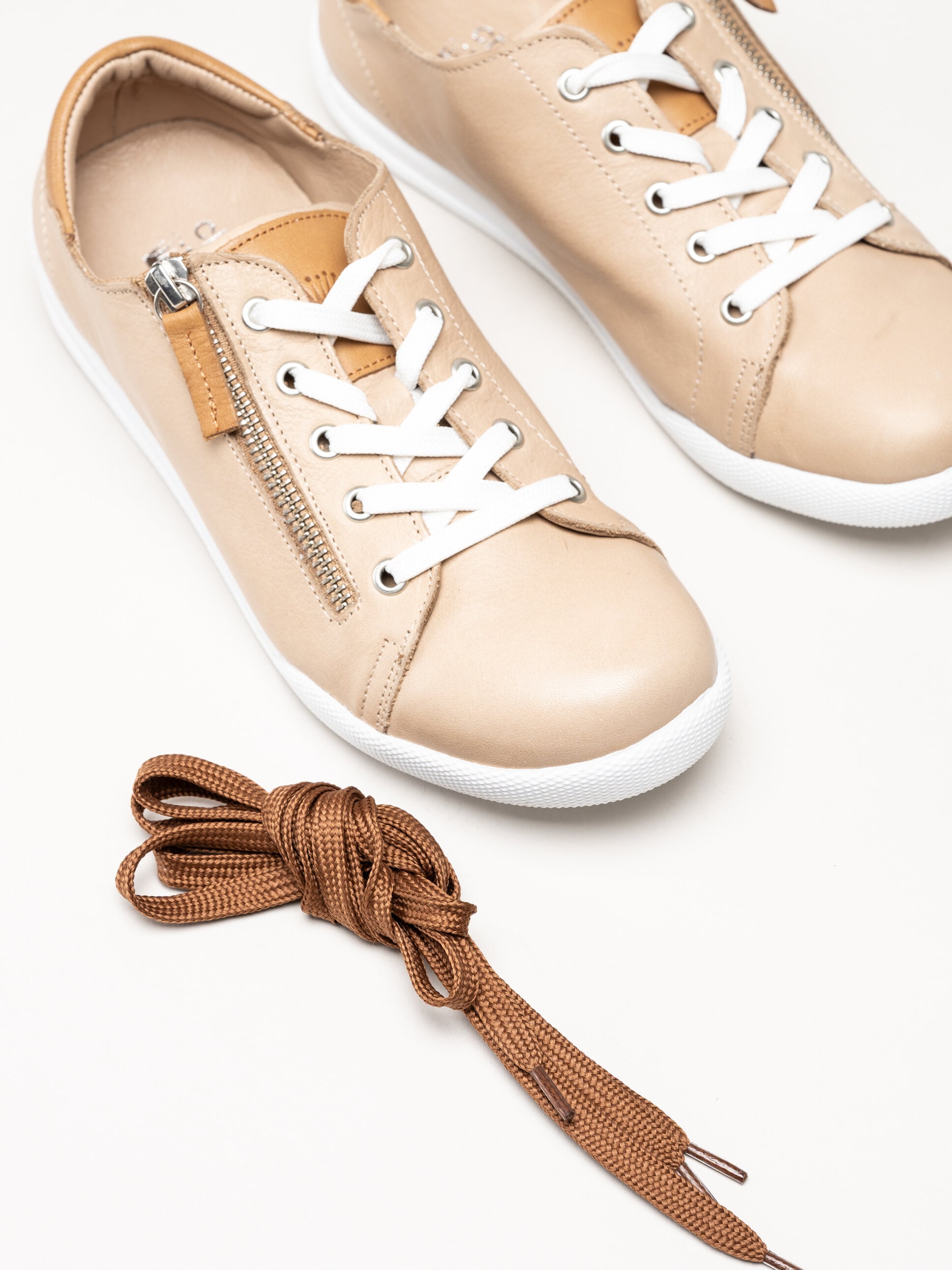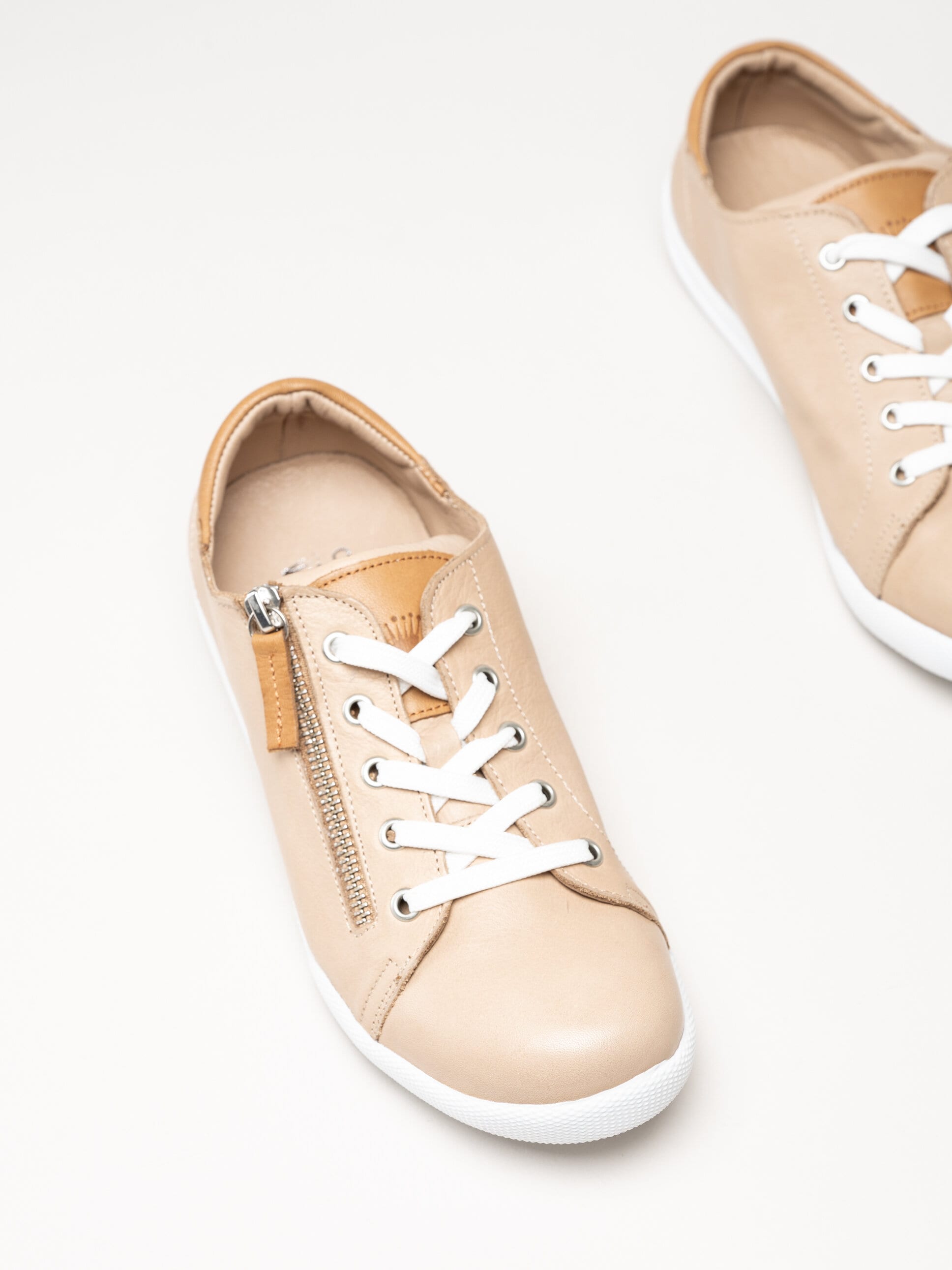 Beige sneakers i skinn från Charlotte of Sweden i färgen New Camel/Brandy. Skorna är tillverkade i mjukt och följsamt skinn som ger ett stilrent och tidlöst uttryck, samtidigt som den mjuka konstruktionen bidrar till hög komfort under hela dagen. Modellen har klassisk snörning framtill i kombination med en praktisk dragkedja på utsidan, vilket gör skorna enkla att ta av och på samt ger en justerbar och stabil passform. Invändigt är skorna fodrade med skinn för en behaglig känsla mot foten, och den löstagbara innersulan i skinn gör det möjligt att anpassa komforten eller byta sula vid behov.