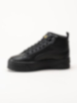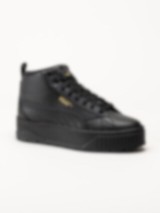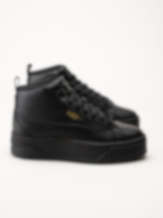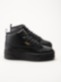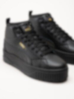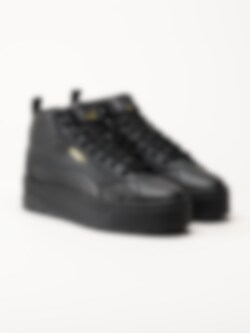Svarta höga platåsneakers Karmen II Mid Black Black Gold från Puma. Trendiga stilrena sneakers i skinn. Innerfoder och avtagbar innersula i textil, svart yttersula i gummi med mönster för bra grepp på underlaget. En tuff och sportig modell som utstrålar en härlig attityd.