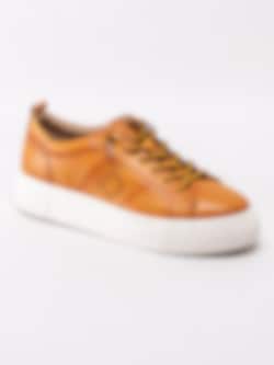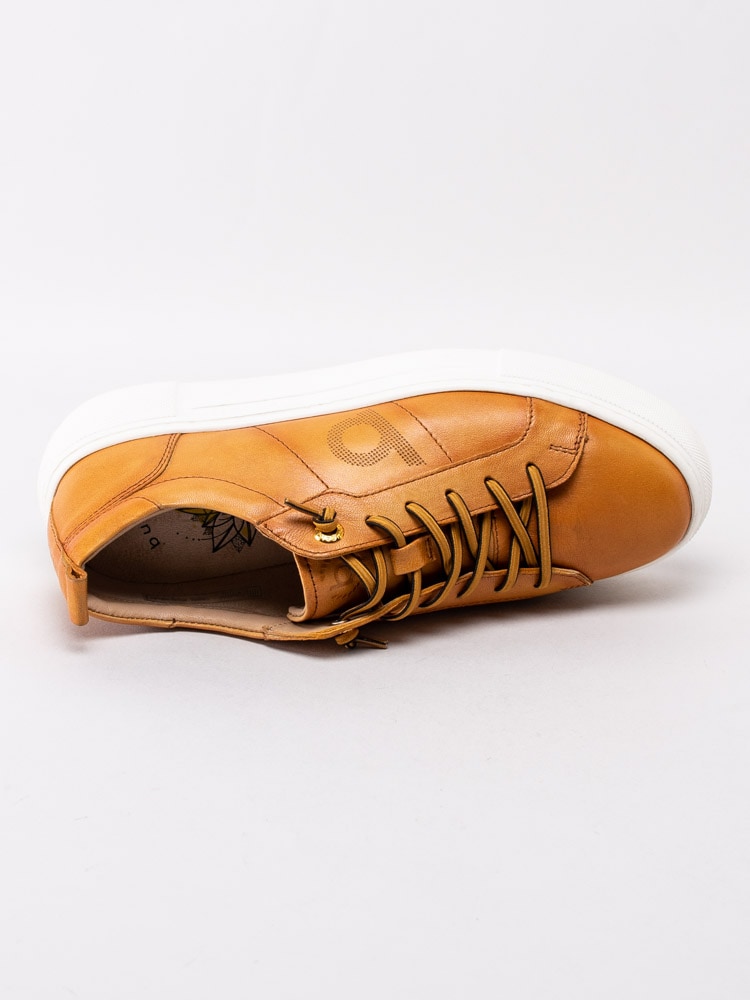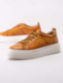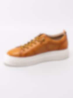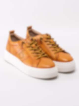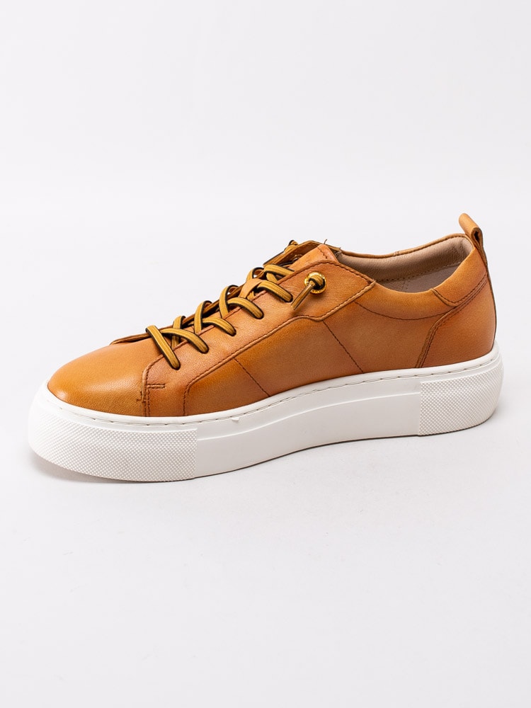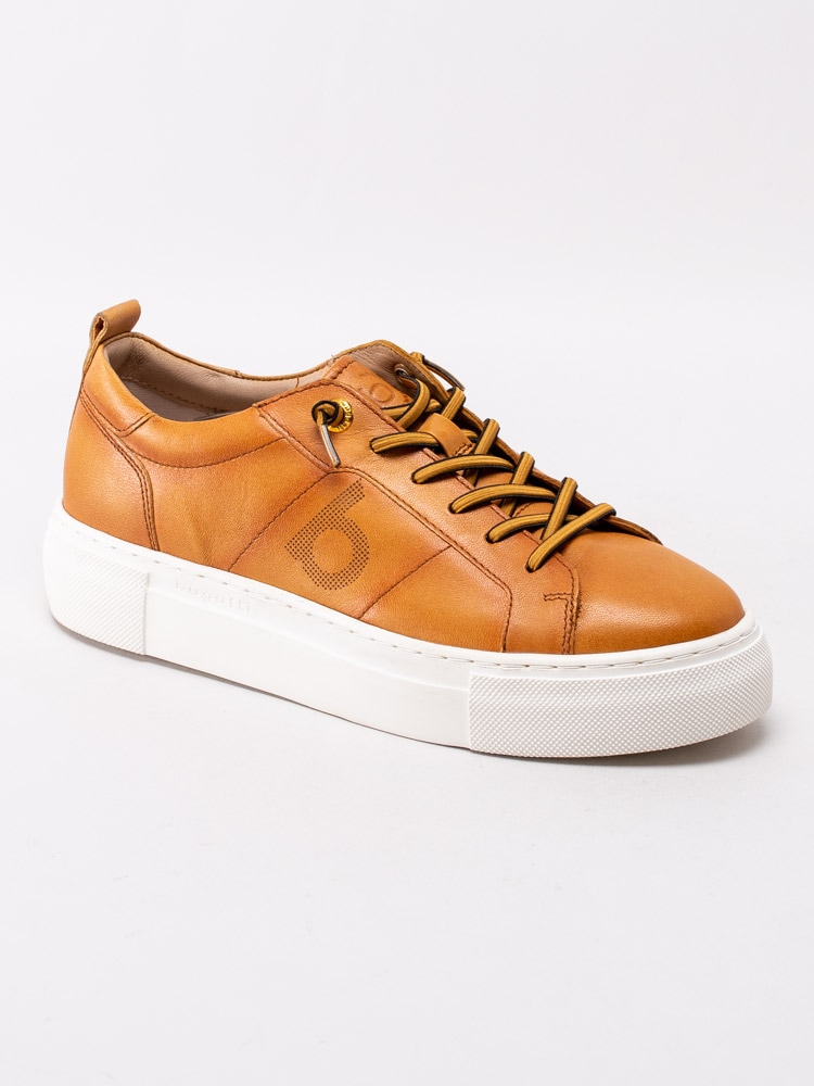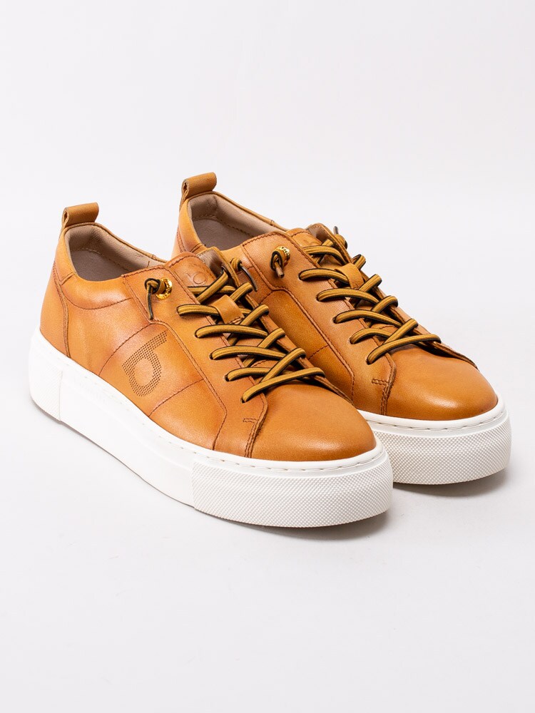 Gula sneakers Infinity från Bugatti i fint skinn. Moderna platåsneakers med prickad logotyp på utsidan. Gulsvart 6-håls snörning i bomull med knutna ändar för att slippa att knyta skorna. Textilfodrade med löstagbar innersula i textil. Tjock platåsula på ca 3 cm med subtil logotyp på utsidan.