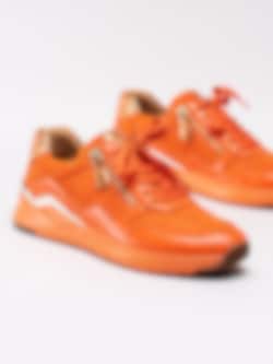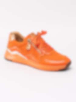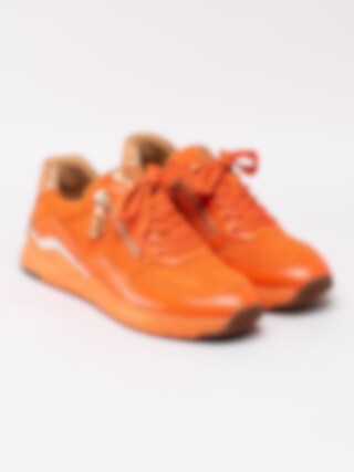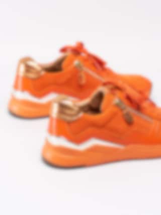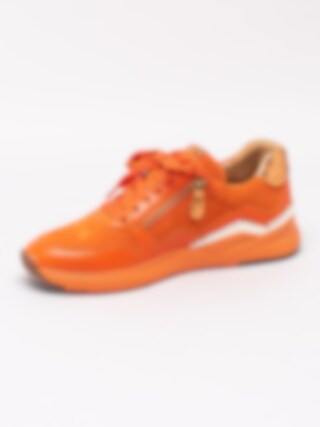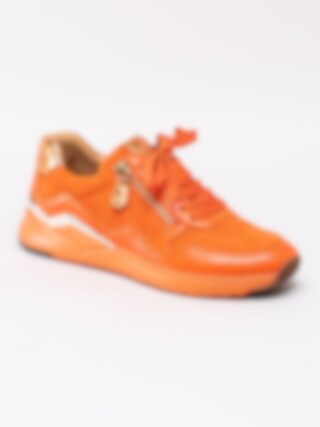 Fräcka sneakers från Gabor tillverkade i mocka, skinn och syntet. Gulddetaljer som matchar perfekt till den orange färgen! Snygga sneakers som inte bara skriker "villhöver" utan också känns väldigt lätta och sköna på fötterna. Dragkedja på varsin sida om snörpartiet för att kunna ge dig en smart och snabb lösning hur du smidigt kommer i och ur skorna utan att alltid behöva snöra upp. Textilfodrade med en skön, löstagbar innersula i skinn. Orange yttersula med gummerad häl och tå.