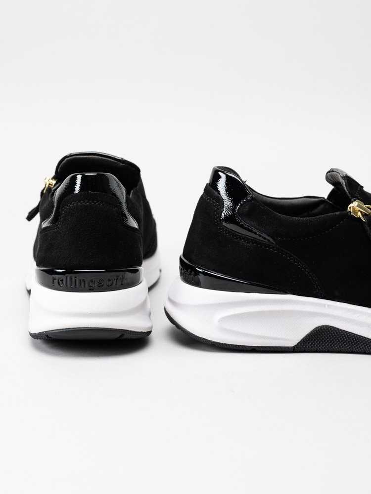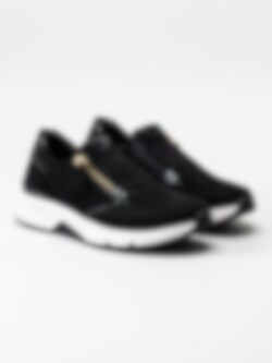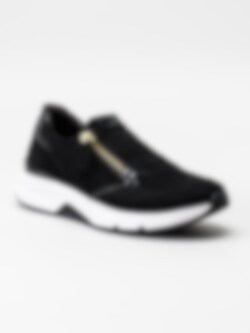 Svarta sneakers i mocka med zip från Gabor. Sköna promenadskor utrustade med Rollingsoft som ger en stabil och skön gång i den rullande effekten. Textilfodrade med löstagbar innersula i skinn.