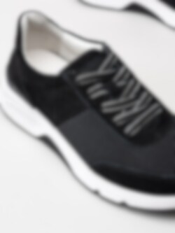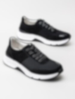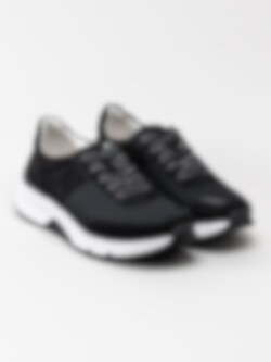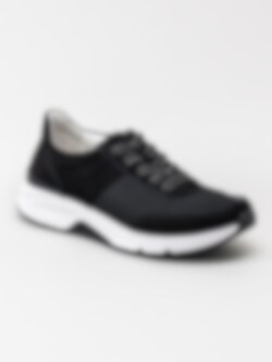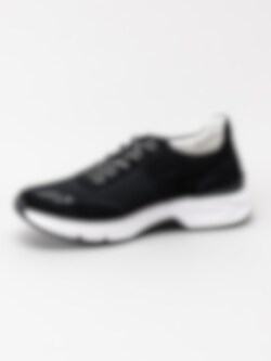 Svarta promenad-sneakers från Rollingsoft Sensitive by Gabor i mocka och stickad mesh. Svart 5-håls klassisk snörning i bomull för att justera till skön individuell passform och mjukt fodrad plös. OptiFit praktisk löstagbar innersula klädd i skinn som känns riktigt skön mot foten. Insidan i skinn och textil. Yttersulan i gummi och syntet. Rollingsoft sensitive är sulan med unik flexibilitet. Den är superlätt och i flera lager vilket ger stöd och stabilitet under hålfoten. Den rullande sulan ger en skön övergång i varje steg utan att påverka balansen eller att det märks. Man går helt enkelt otroligt bekvämt. Är du ute och går mycket så är denna sko ett självklart val, en snygg klassiker som passar många fötter.
