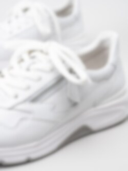 Vita promenadskor från Gabor i skinn. Stilren och sportig modell med Rolling Soft teknik, en flerlagers sula gjord som en stabilisator under fotvalvet. Dekorativ dragkedja på utsida. En självklar fräsch favorit till våren.