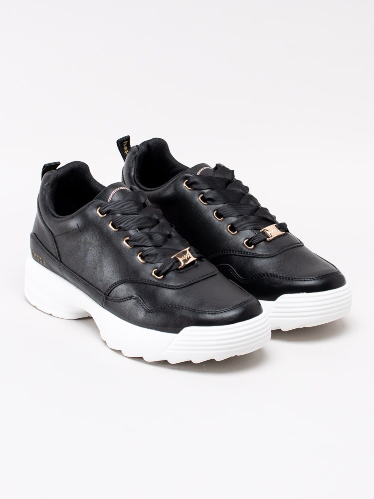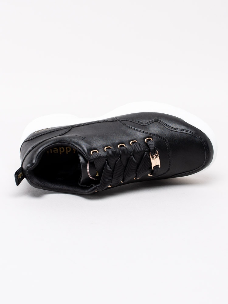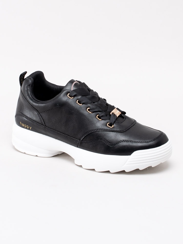 Svarta sneakers Happy World Tip från Happy Shoes tillverkade i veganskt läder. En uppdaterad design av Happy World kommer nu Happy World Tip. Chunky sneakers med samma tjocka sula men med detaljer som roséfärgade öljetter och smyckeslogga på sidensnörning. Hälla i nylon med logotyp på bakskaft som hjälpmedel vid påtagning. Subtil logotyp i guld på utsidan på bakparti. Vit tjock sula på ca 4 cm med platå på ca 3 cm.