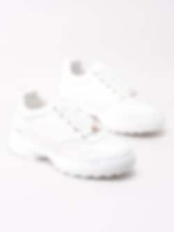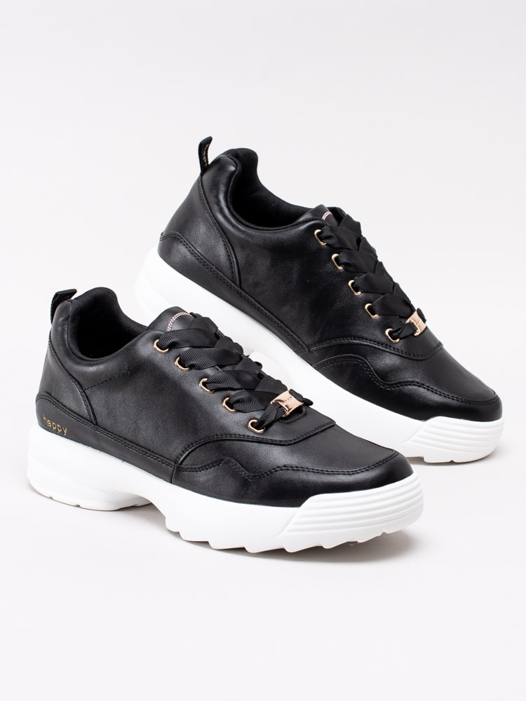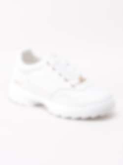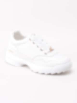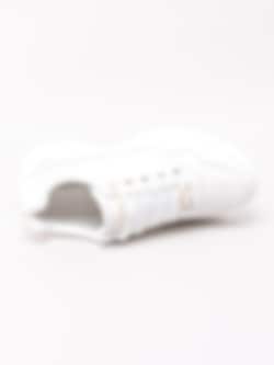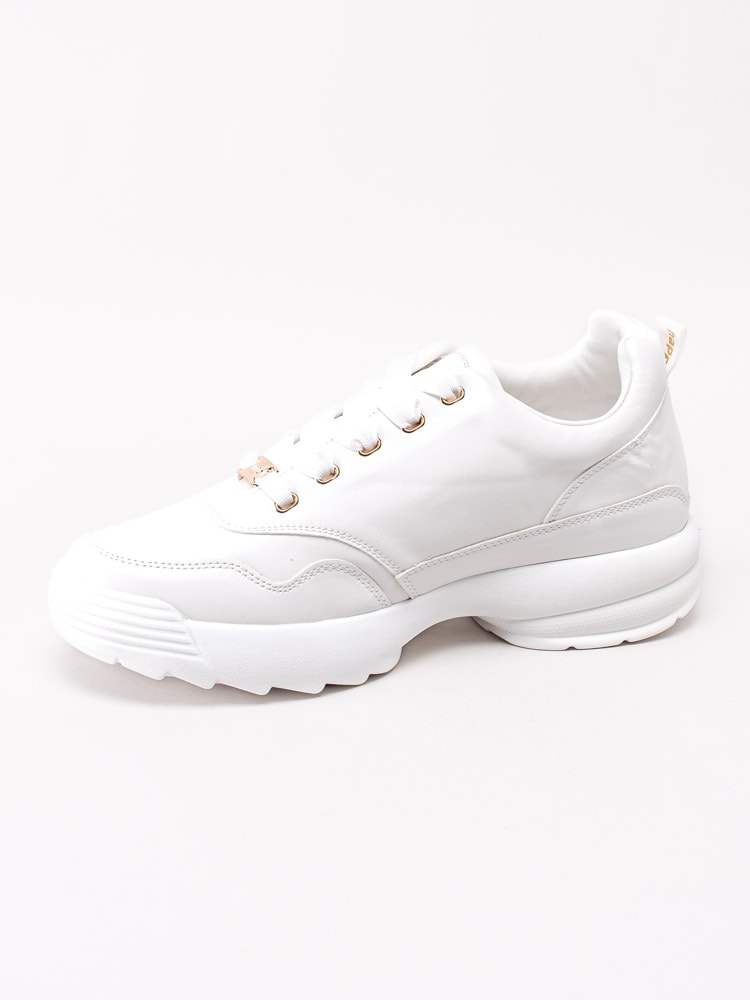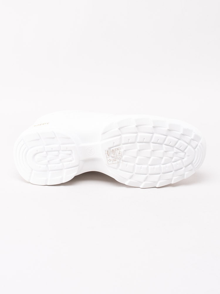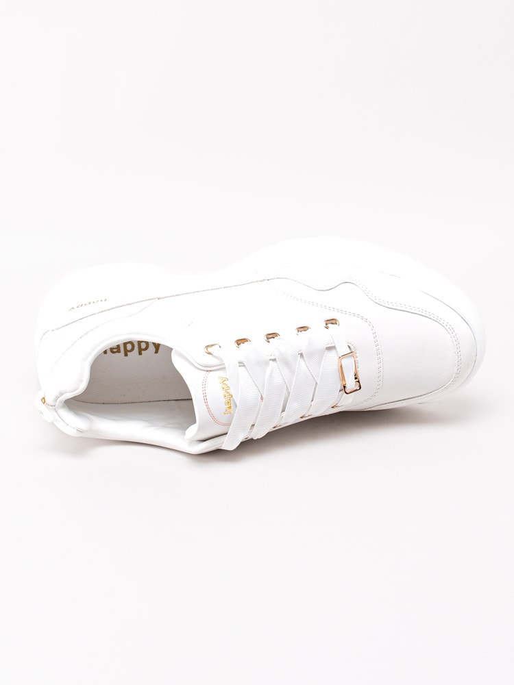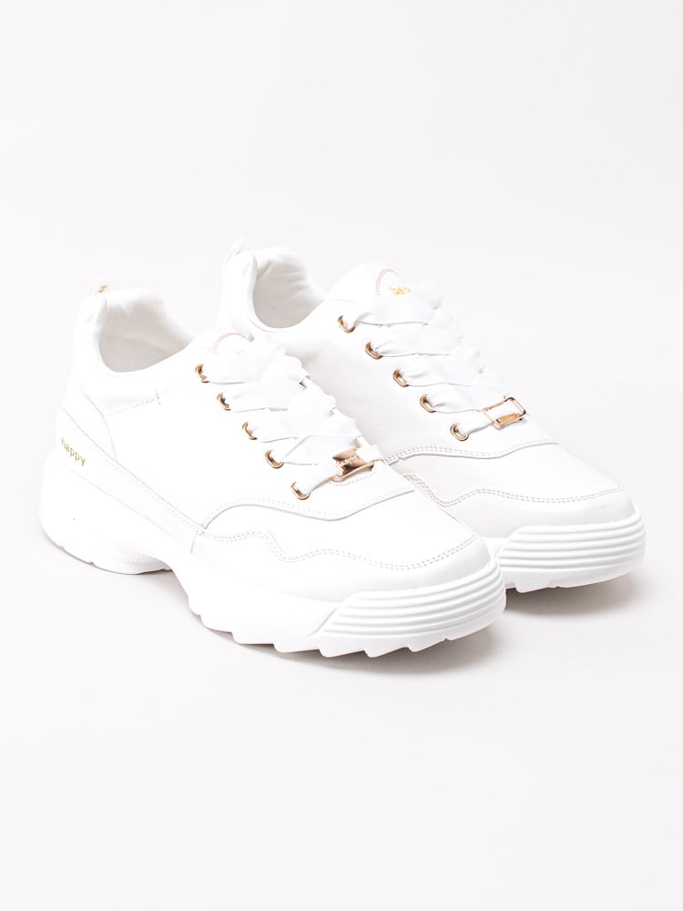 Vita sneakers Happy World Tip från Happy Shoes tillverkade i veganskt läder. En uppdaterad design av Happy World kommer nu Happy World Tip. Chunky sneakers med samma tjocka sula men med detaljer som guldfärgade öljetter och smyckeslogga på sidensnörning. Hälla i nylon med logotyp på bakskaft som hjälpmedel vid påtagning. Subtil logotyp i guld på utsidan på bakparti. Vit tjock sula på ca 4 cm med platå på ca 3 cm.