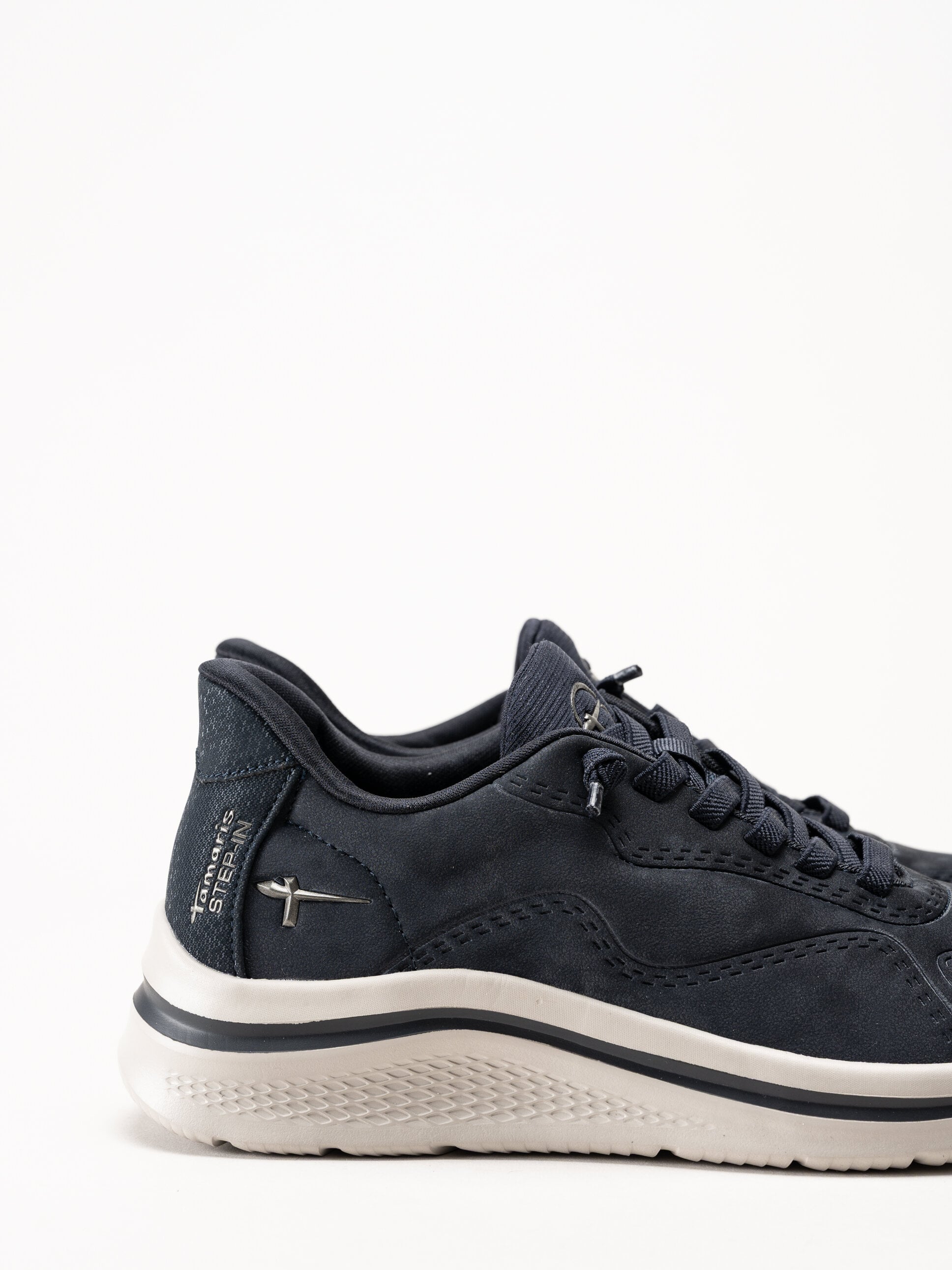 Mörkblå sneakers i skinnimitation från Tamaris Comfort i färgen Navy. Skorna är tillverkade i lätt syntetmaterial som ger ett stilrent och följsamt uttryck. Modellen har en rymlig H-läst och step in-funktion, det flexibla materialet i bakkappan i kombination med elastiska snören gör skorna extra enkla att ta av och på, utan att kompromissa med komforten.