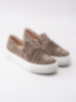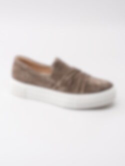 Slip on Lima från Legero. Brun lågsko tillverkad i mocka. Resår på in- och utsidan för lätt på- och avtagning. Beigt foder och löstagbar innersula i skinn med sömlös logga. Vit platåsula på ca 4 cm. Yttersula i syntet med sicksackmönster och logga.