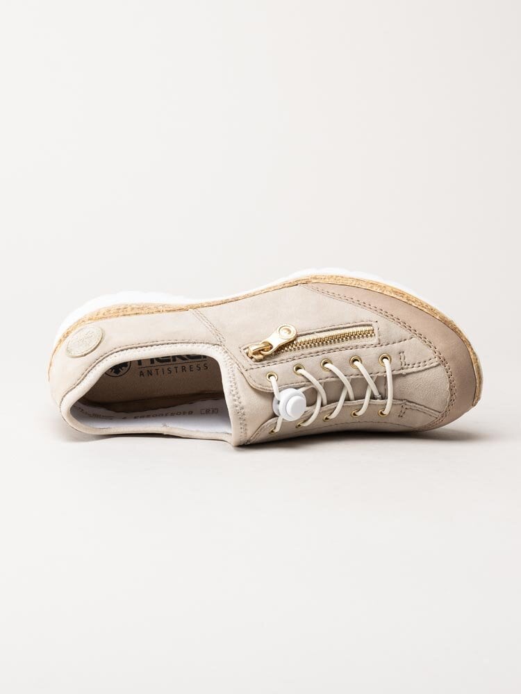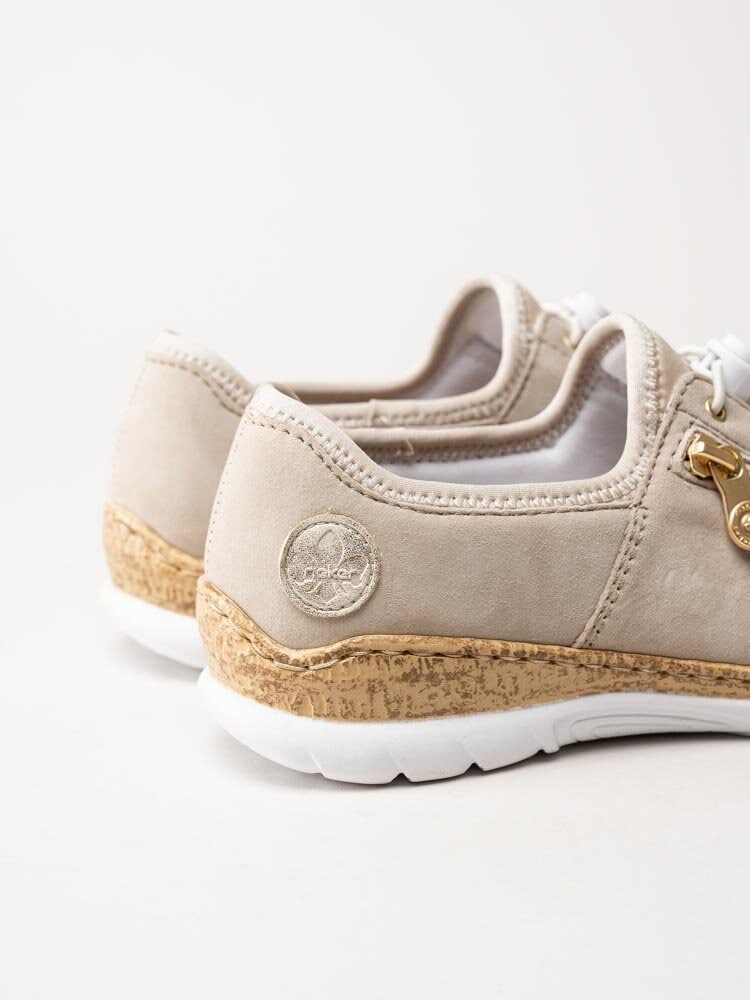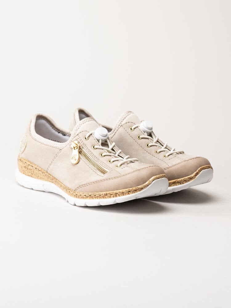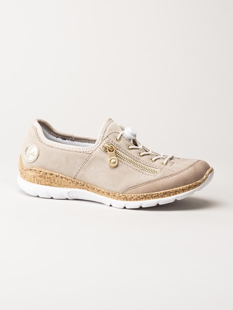 Beige slip-on skor i mocka från Rieker i färgen Iceberg. Skorna är tillverkade i mjuk mocka med textildetaljer som ger ett stilrent och lätt uttryck, perfekt för vardag och fritid. Den elastiska slip-on-designen med resårsnören gör skorna enkla att ta på och ger en följsam passform, medan den dekorativa dragkedjan tillför en modern detalj.