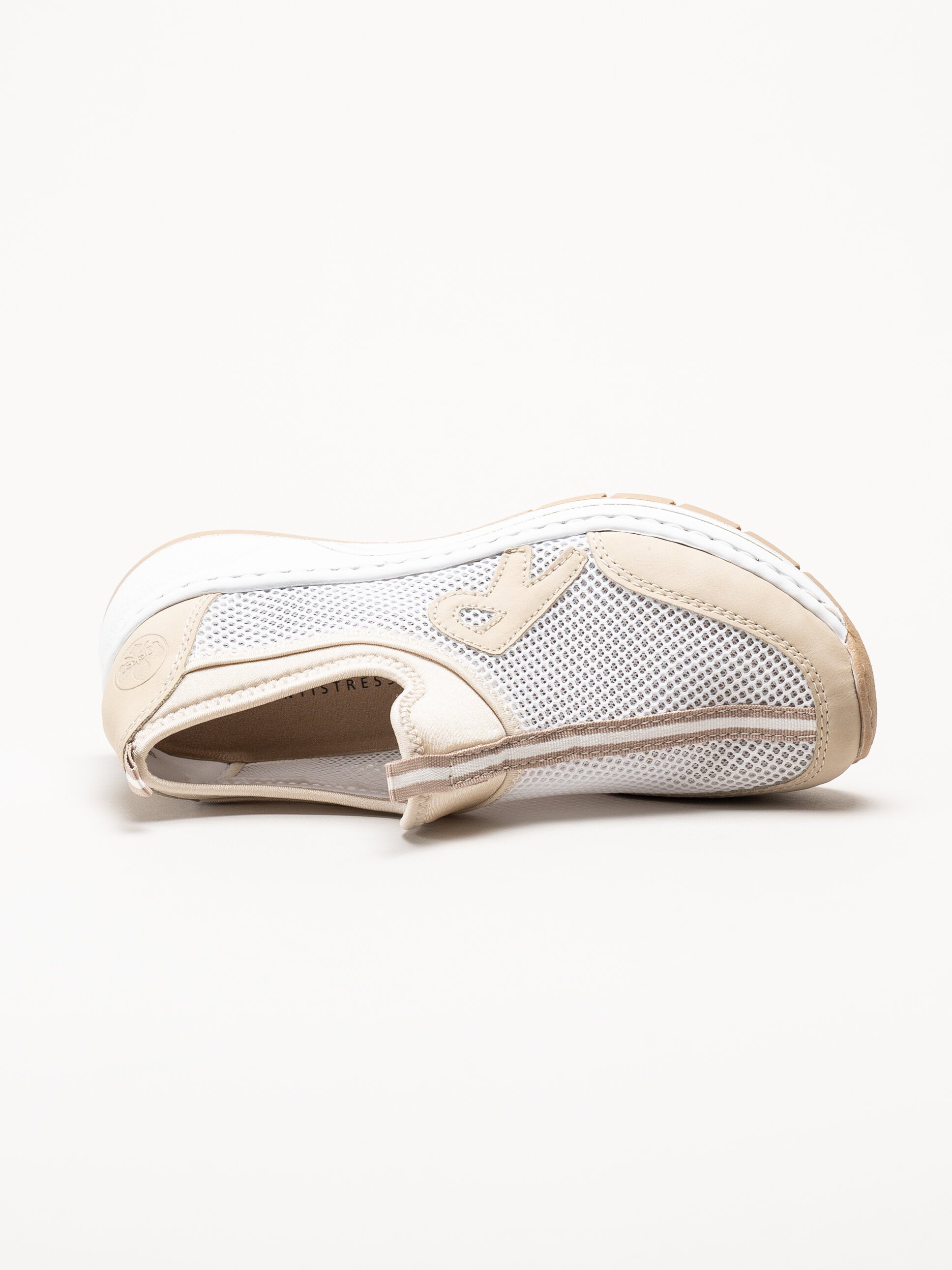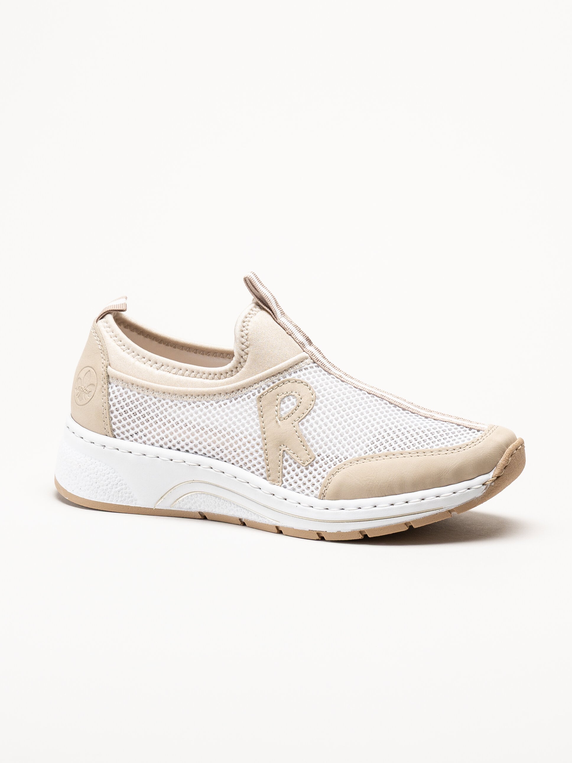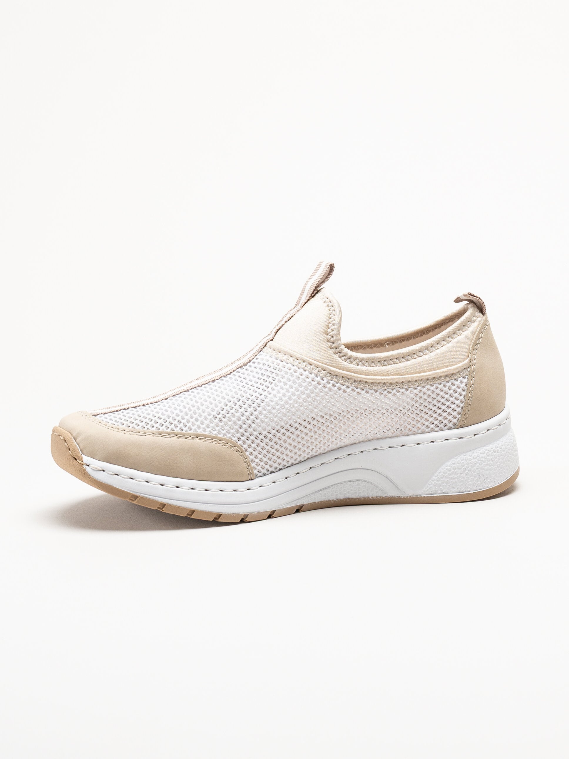 Beige slip-on sneakers från Rieker i färgen Perle med en lätt och avslappnad design. Ovandelen är tillverkad i en kombination av textil och syntet som ger ett följsamt och bekvämt uttryck. Den smidiga slip-on modellen gör skorna enkla att ta på och av, och en praktisk draghälla baktill underlättar ytterligare vid påtagning.
