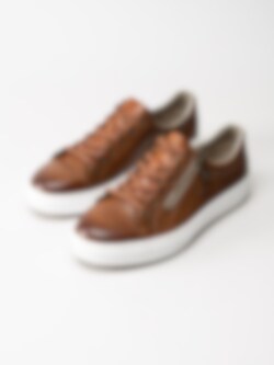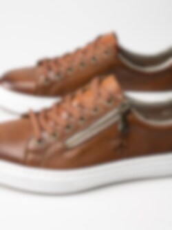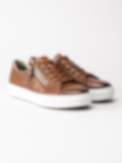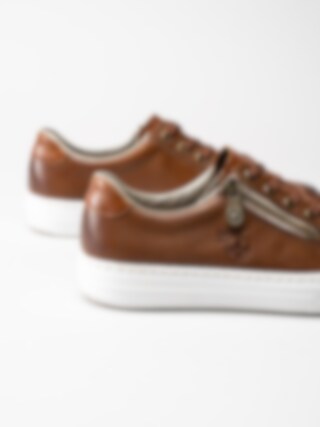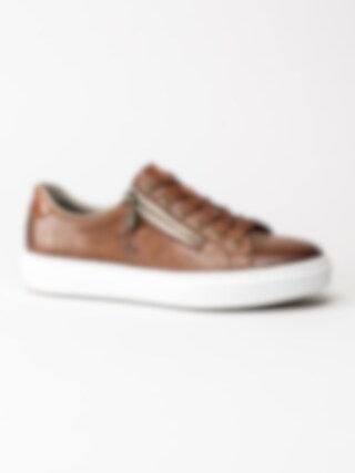 Bruna sneakers i skinn från Rieker. Släta sneakers med platt 6-håls snörning i polyester, dragkedja på utsidan för att du enkelt ska kunna ta dig på skorna utan att behöva snöra om. Präglad, subtil logga på utsidan. Foder i syntet med en skön, skumgummi innersula i textil för extra komfort som håller hela dagen. Vit platåsula på ca 3 cm beige räfflad gummisula.