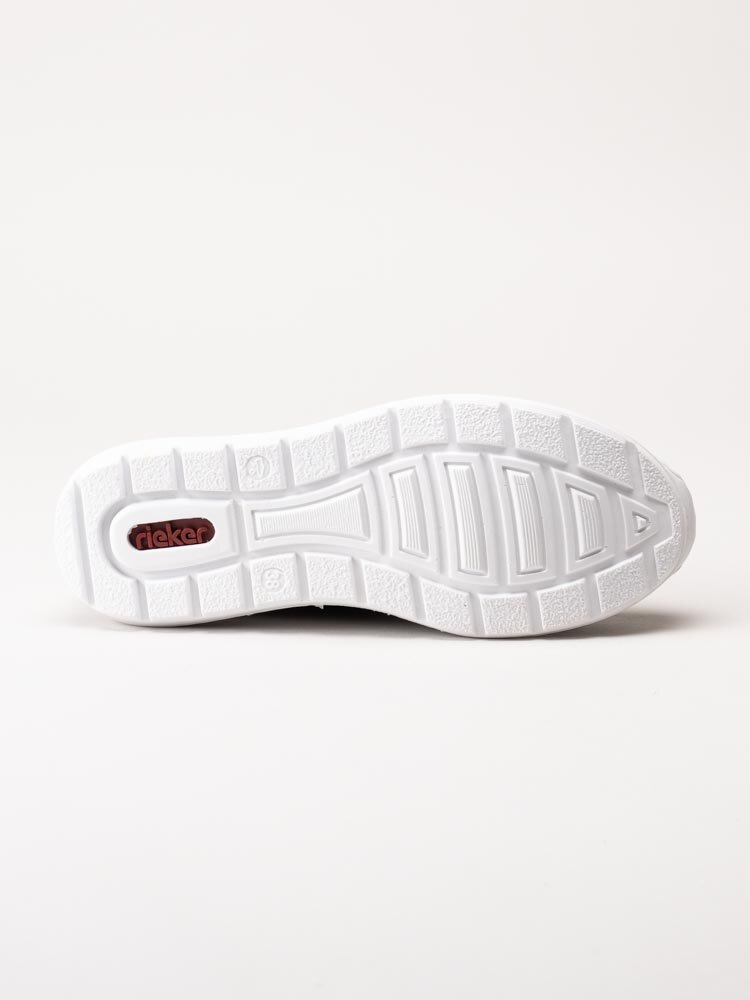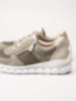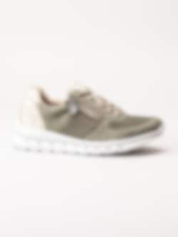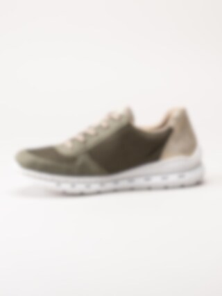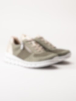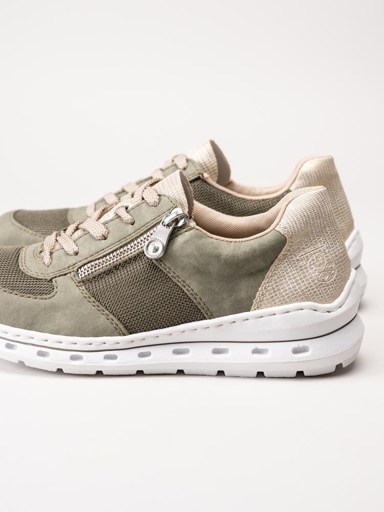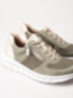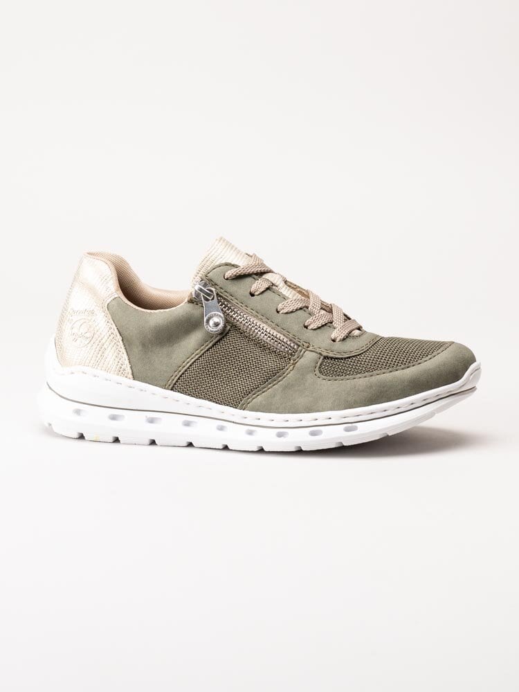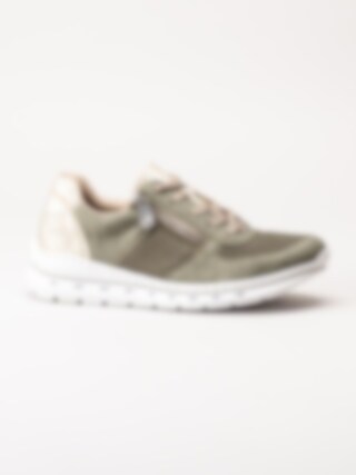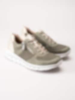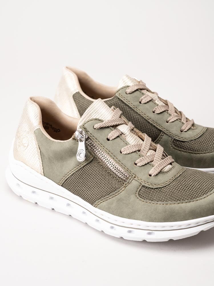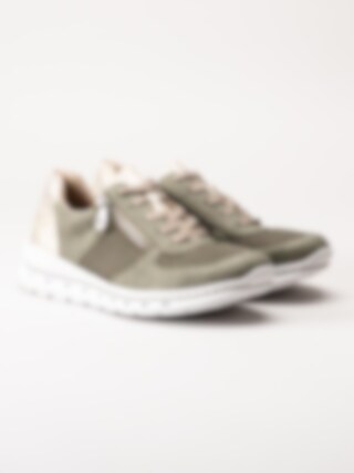 Gröna sneakers i textil och syntet från Rieker. Fin promenadsneaker med 5-håls snörning och dragkedja på utsidan i en härlig grön färg med detaljer i guld på plösen och bakkappan. Polstrad kant och Riekers MemoSoft innersula för skön komfort. En härlig sko att spendera den kommande våren i!