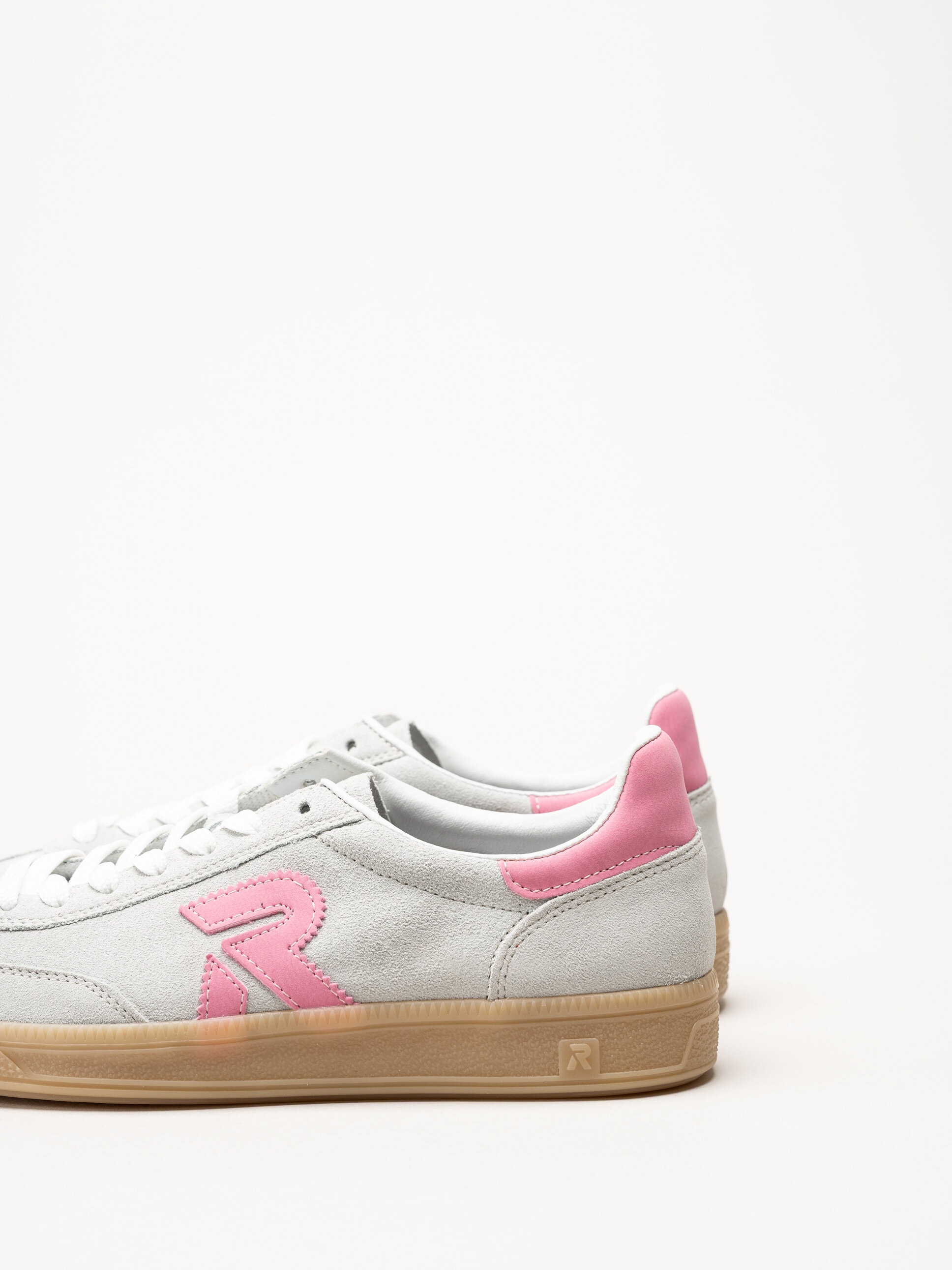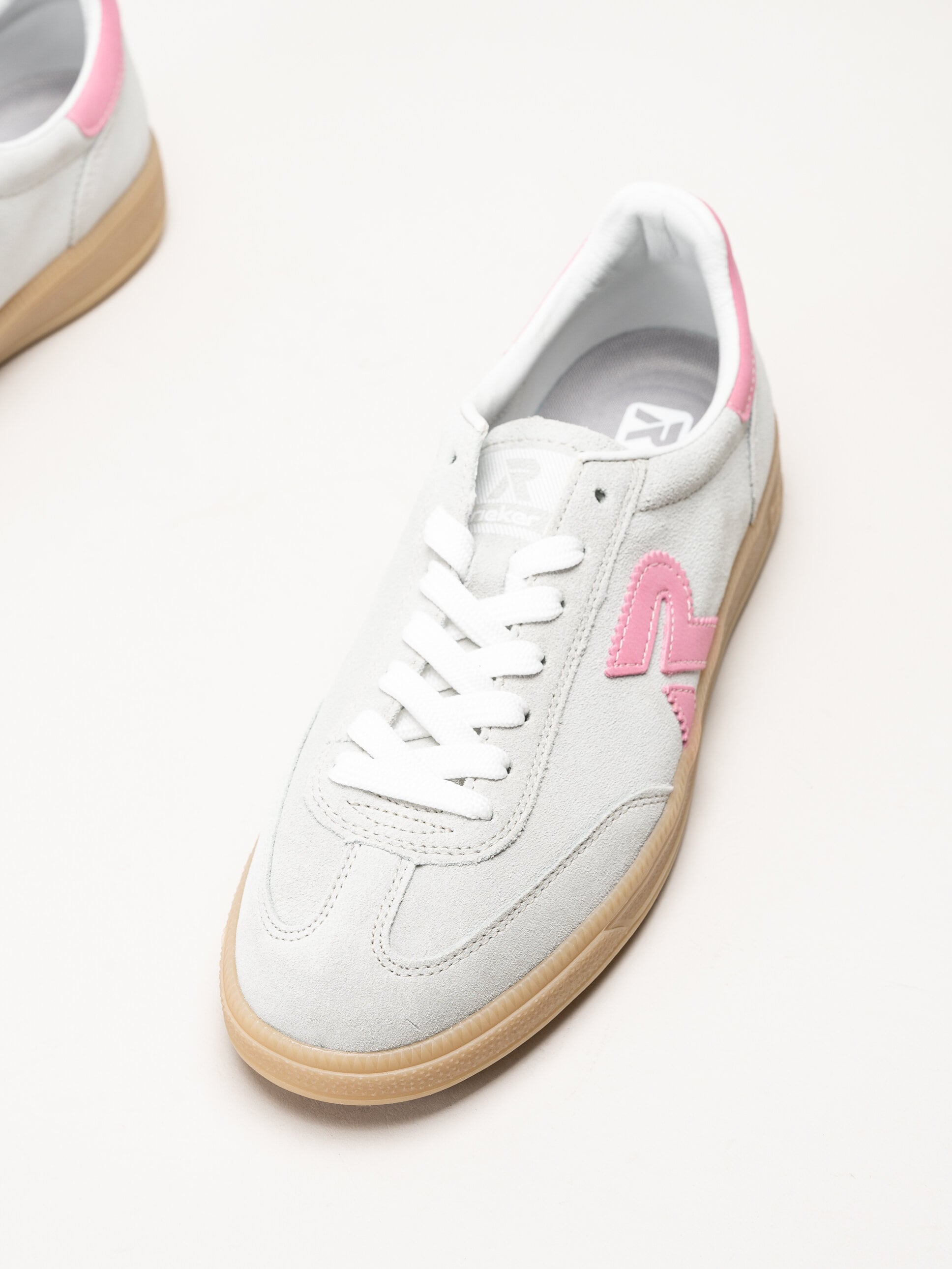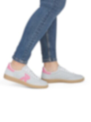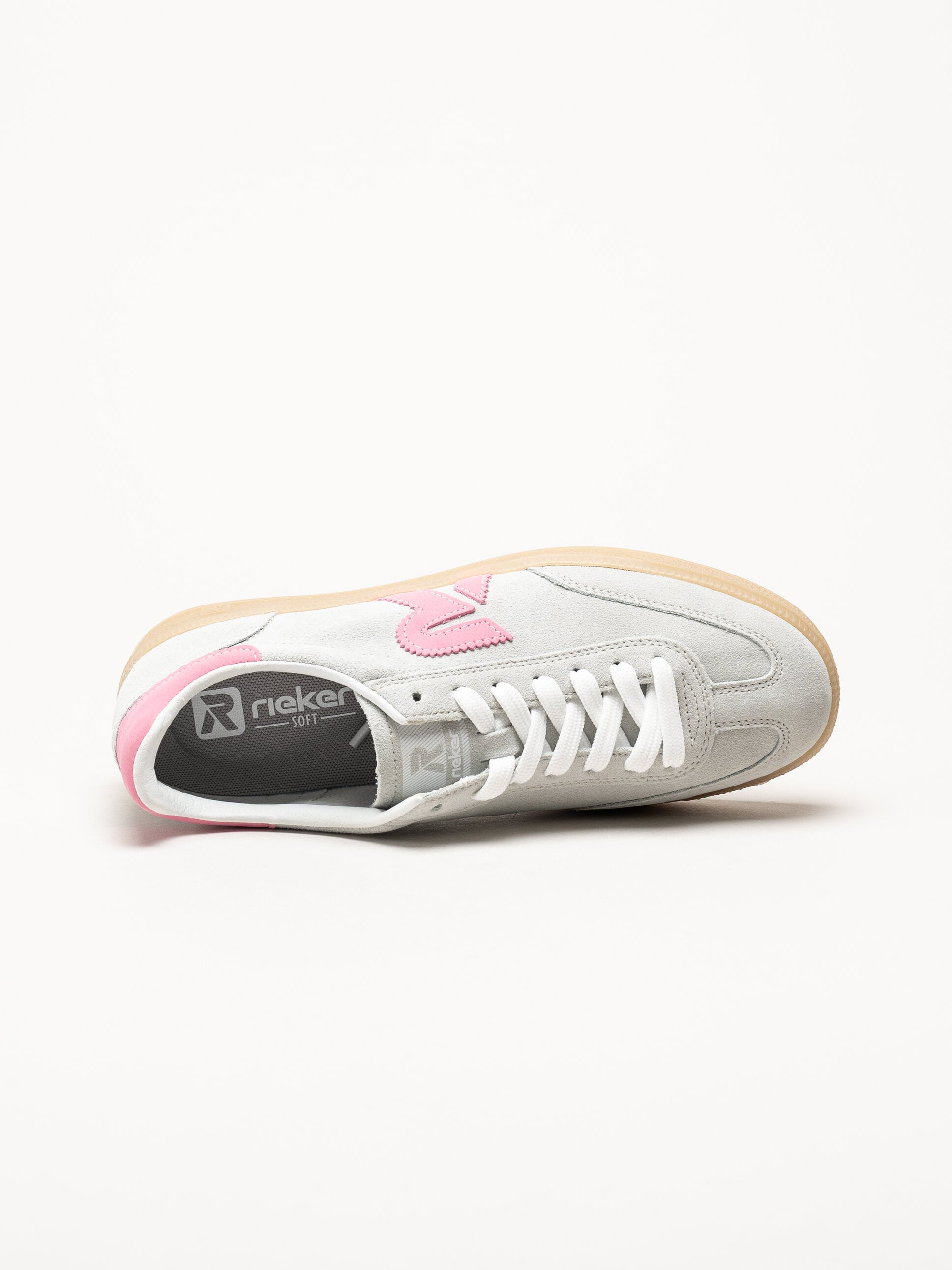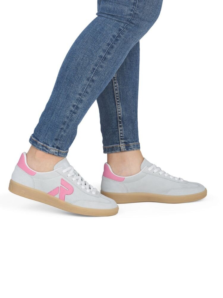 Ljusgröna med grå underton sneakers i mocka från Rieker i färgen Pelecyan pink. Skorna är tillverkade i mjuk mocka som ger ett stilrent och feminint intryck med en lätt retroinspirerad silhuett som passar perfekt för vardag och fritid.