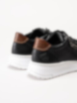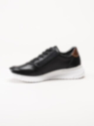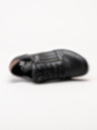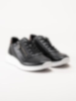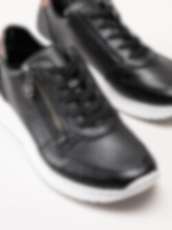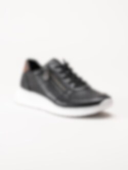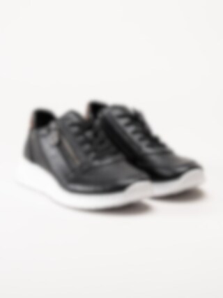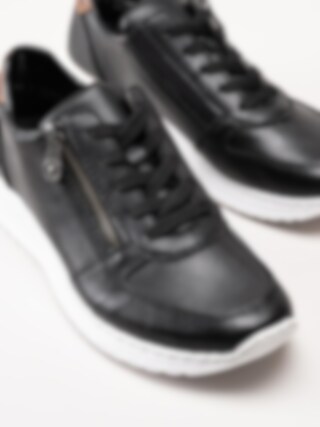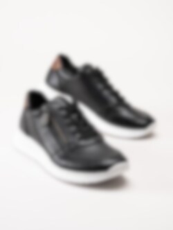 Svarta sneakers i skinn från Rieker. Ett par stilrena promenadskor med bredare läst för dig som behöver lite mer utrymme. 5- håls snörning för perfekt passform och dragkedja på utsidan för smidig på- och avtagning. Innersula i skinn med Riekers antistress teknologi och stötdämpande yttersula i syntet. En nätt och lätt sneaker som är perfekt till vårens härliga dagar!