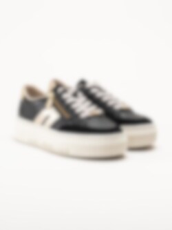 Svarta platåsneakers i skinn från Rieker i färgen Black. Skorna är tillverkade i en kombination av skinn och syntet som ger ett modernt och stilrent uttryck med diskreta kontrastdetaljer. Den trendiga platåsulan ger extra höjd utan att kompromissa med komforten och passar perfekt för vardagsbruk. Modellen har klassisk snörning kombinerad med en praktisk dragkedja, vilket gör skorna enkla att ta av och på samtidigt som passformen blir stabil och justerbar.