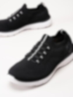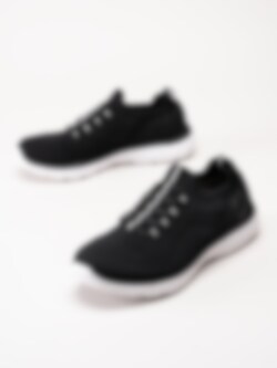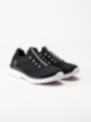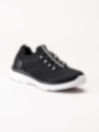 Svarta sportiga promenadskor i textil från Rieker. Snygga svarta sneakers i olika stickade mönster. Dekorativ resårsnörning och liten rund logga på bakkappan. Foder i textil och innersula som också är utrustad med MemoSoft för mjukt och skönt hela dagen. Antistress teknologi i både innersula och yttersula för optimal komfort. Supersnygga till ett par jeans eller chinos.