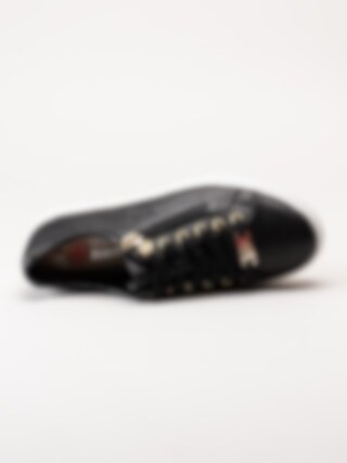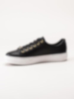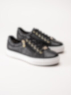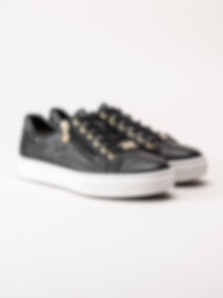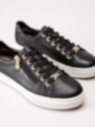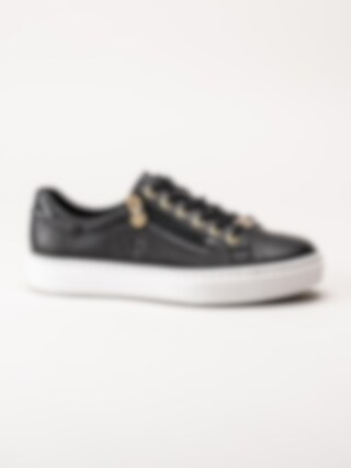 Svarta sneakers i skinn Black från Rieker. Upptäck Rieker svart sneakers - den perfekta kombinationen av stil, komfort och funktionalitet. Dessa sneakers är tillverkade i mjukt, svart skinn och har en trendig design med sexhåls snörning och öljetter, samt en praktisk dragkedja i guld på utsidan för enkel av- och påtagning. Dragkedjan ger både en modern touch och gör det snabbt och smidigt att ta på sig skorna när du är på språng. Innersulan, som är utrustad med memory foam, ger en extra nivå av komfort och anpassar sig efter din fot för att hålla dig bekväm hela dagen. Den klassiska sneakerstilen passar perfekt till både avslappnade och mer stiliga outfits. Yttersulan i gummi ger ett bra grepp på olika underlag. Rieker sneakers är det självklara valet för den som söker en bekväm, funktionell och stilren sko som passar i alla situationer.