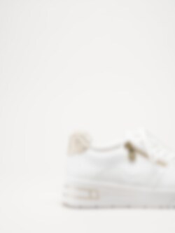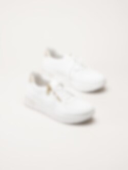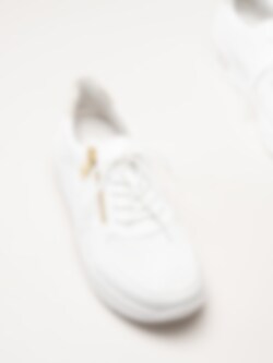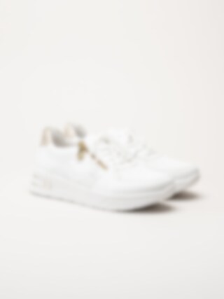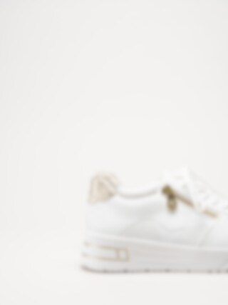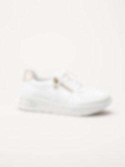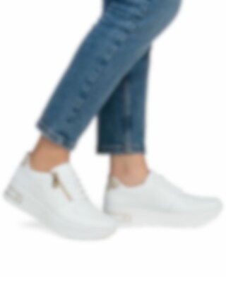Vita sneakers i skinnimitation från Rieker. Skorna är tillverkade i syntet med ett stilrent och lättskött utseende. Den klassiska snörningen framtill gör det enkelt att anpassa passformen, medan dragkedjan på utsidan ger smidig av- och påtagning i vardagen. Modellen har H-läst som ger extra utrymme och en bekväm passform, särskilt för dig som behöver lite mer plats över foten.
