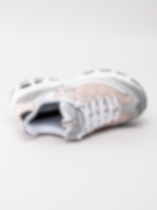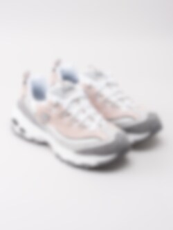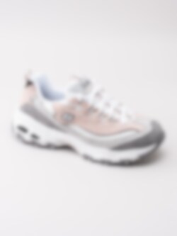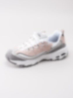 Sneaker DLites Free Energy från Skechers tillverkad i rosa mocka med partier i textil. Sportig platåsneaker med 90-tals stuk. Utrustad med Memory Foam innersula för ökad komfort. Logga på plös och på utsidan. Vit snörning i polyester på 5 hål med öljetter i textil som öppning. Hälla på bakskaft och plös som hjälpmedel vid påtagning. Vitt foder och svart innersula i textil med logga. Vit yttersula i syntet med svarta partier och mönster samt logga.