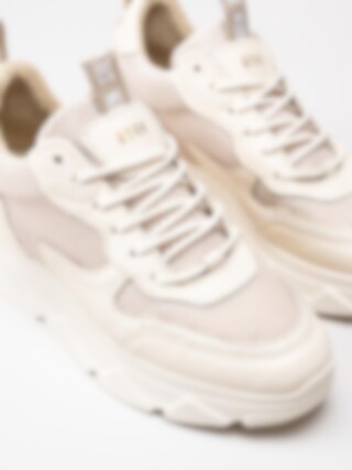 Off white platåsneakers Pitty i skinn och textil från Steve Madden. Skorna har en stor plattformssula och vadderad uppbyggnad som ger en skön känsla med lekfull attityd. Skorna är små i storleken, vi rekommenderar att man går upp en storlek.