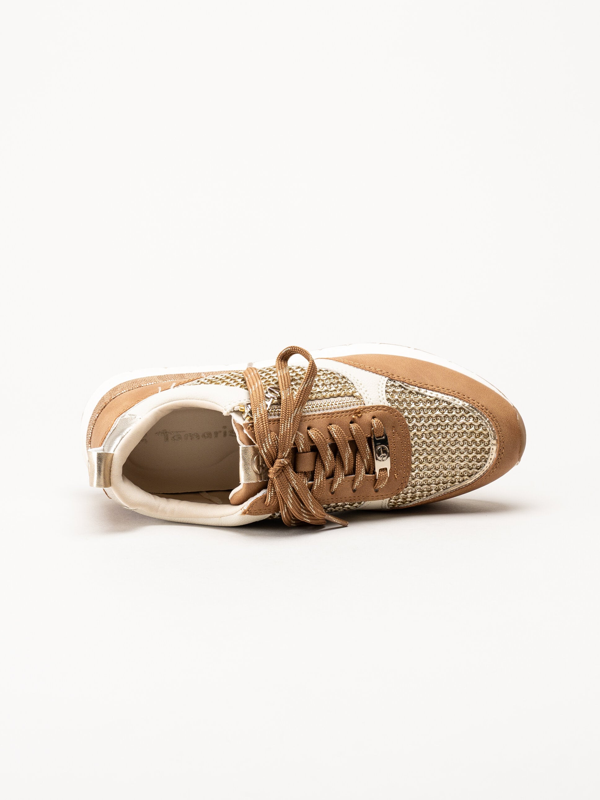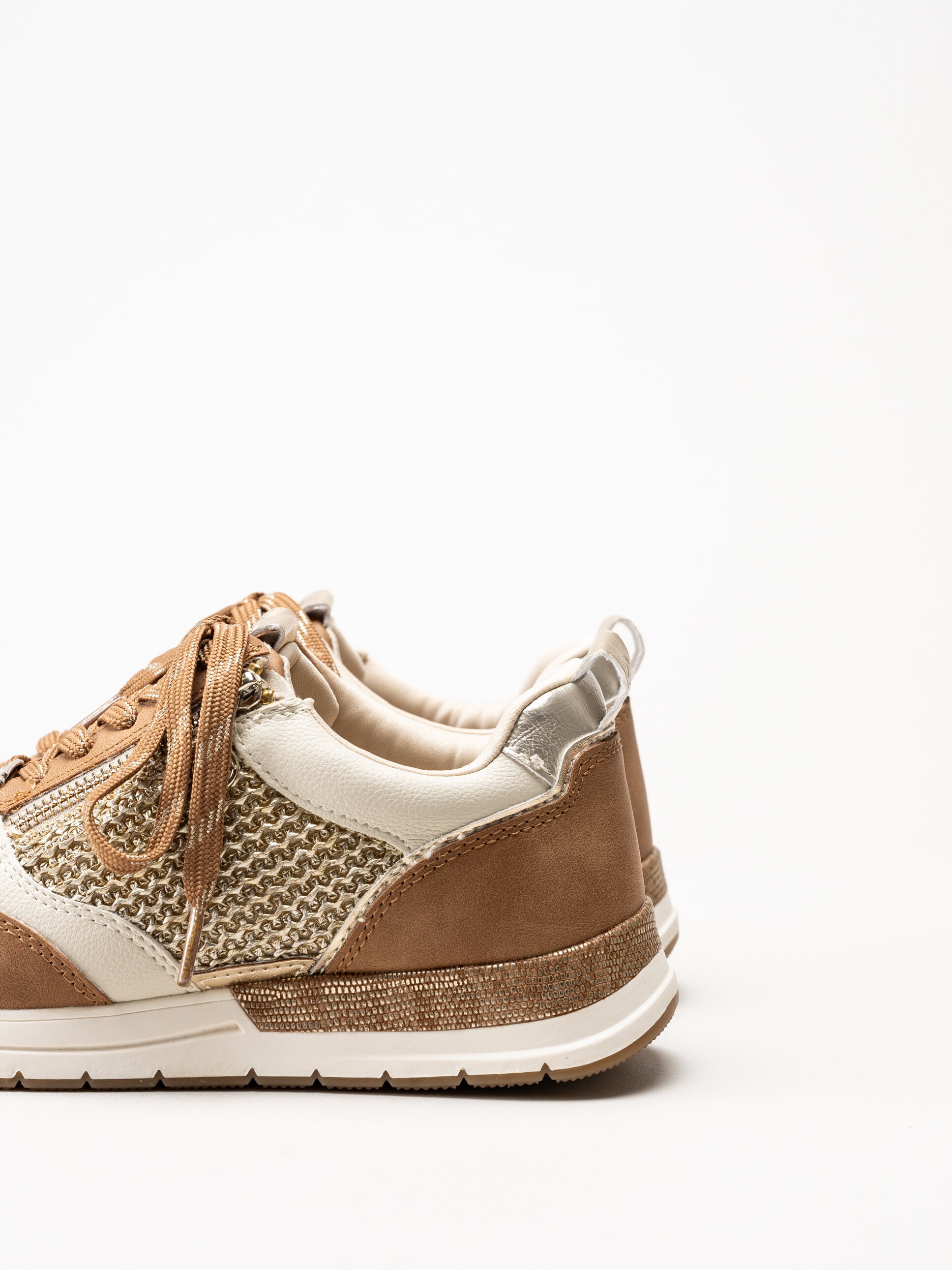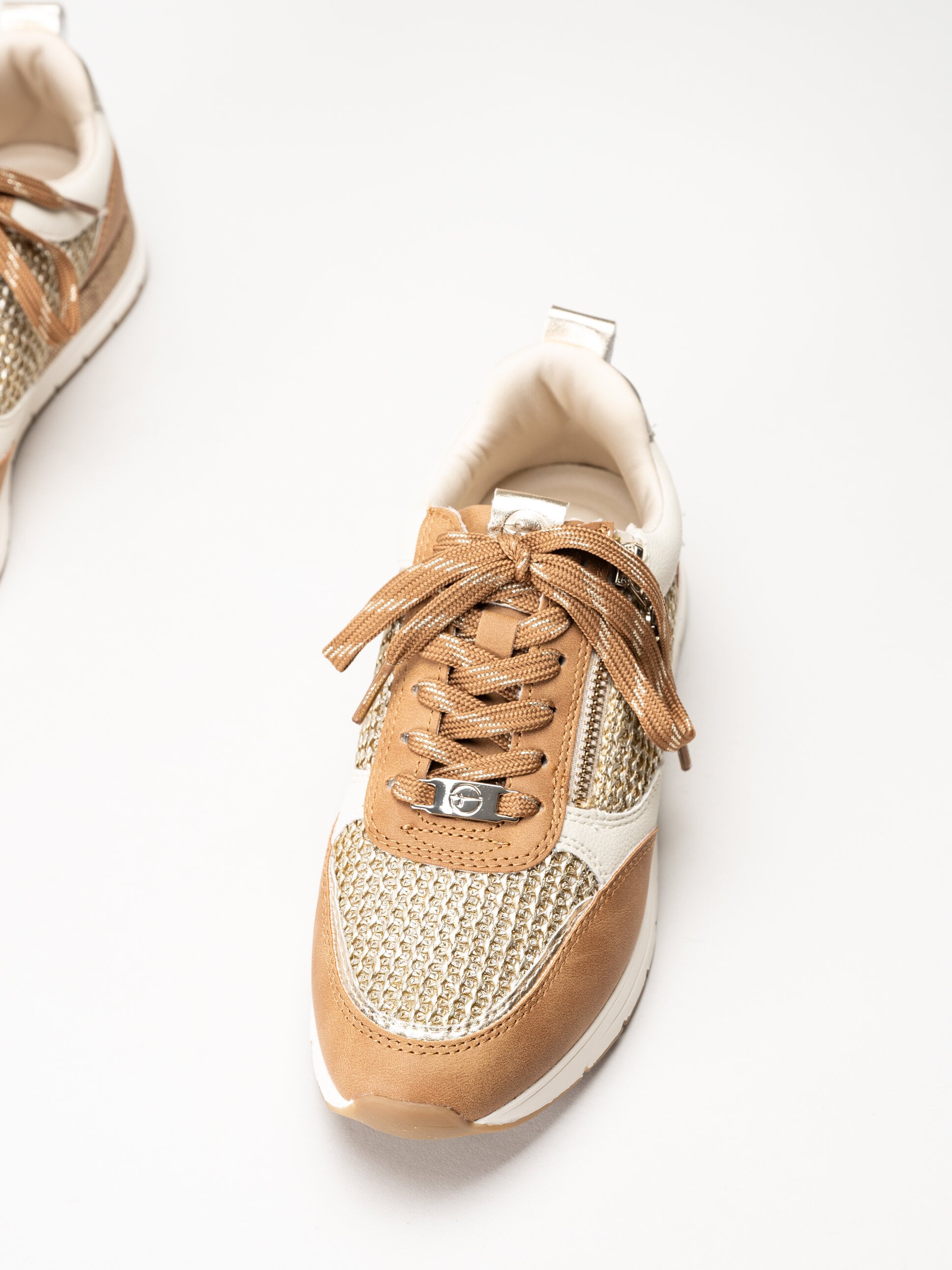Bruna sneakers med dragkedja från Tamaris i färgen Cognac Combi. Skorna är tillverkade i en kombination av syntet och raffia som ger ett stilrent uttryck med en naturlig och luftig känsla. Den klassiska snörningen framtill gör det enkelt att justera passformen, medan dragkedjan på utsidan gör dem smidiga att ta på och av i vardagen.