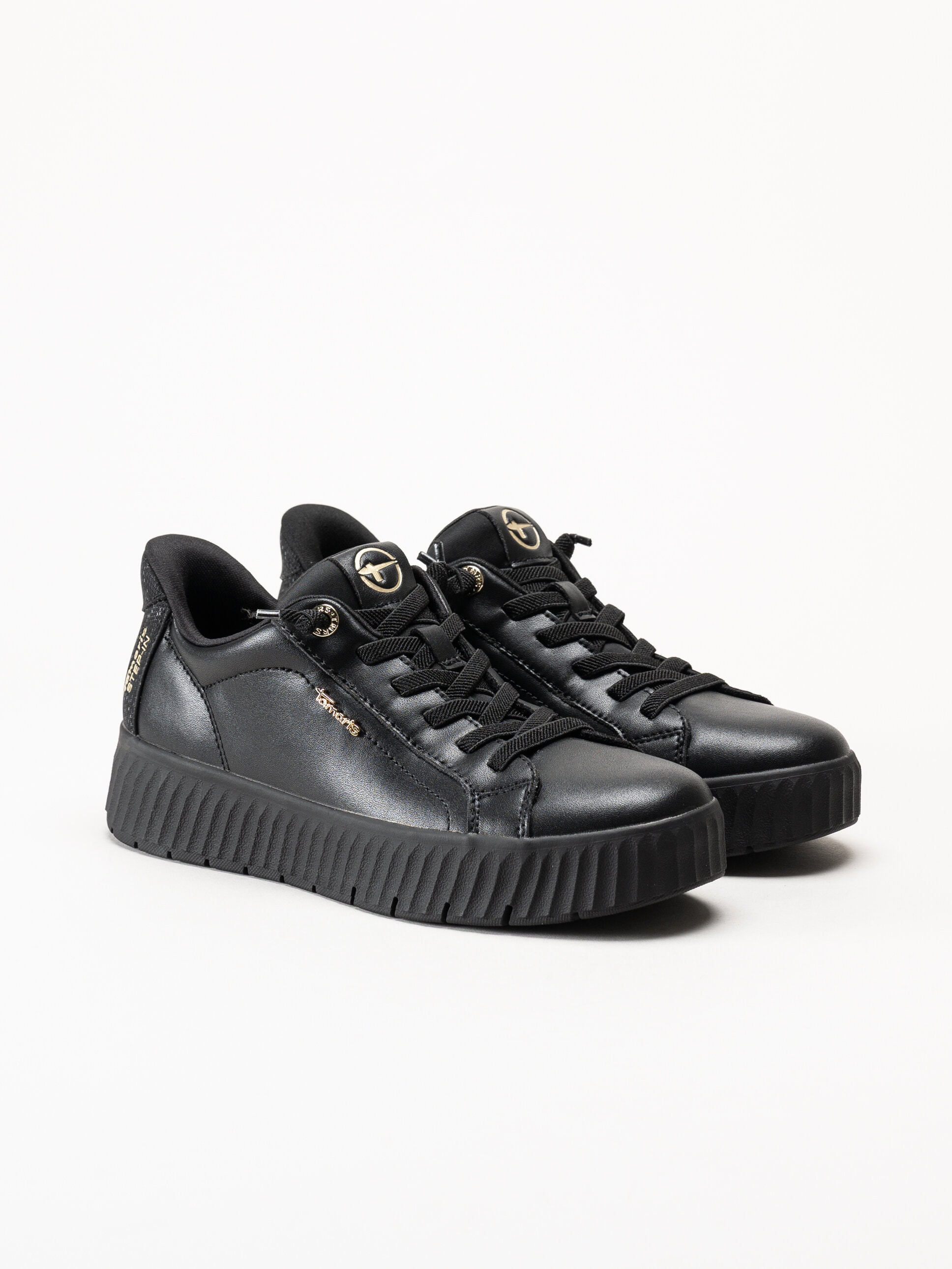 Svarta sneakers i skinn från Tamaris Comfort i färgen Black. Bekväma och stilrena sneakers tillverkade i en kombination av skinn, textil och syntet för en följsam och hållbar konstruktion. Modellen har en H-läst som ger en rymligare passform och extra komfort för dig som behöver mer utrymme framtill. De guldiga detaljerna ger skorna ett elegant lyft och en modern touch.