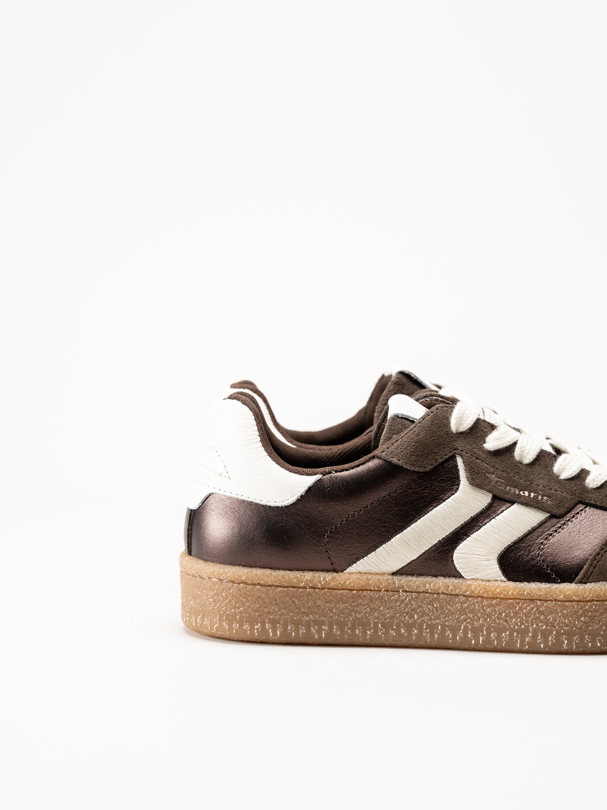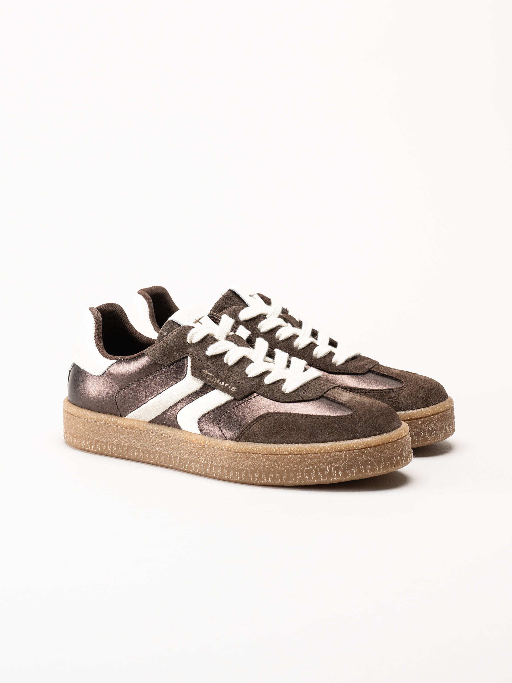 Mörkbruna sneakers i skinn och mocka från Tamaris i färgen Brown Metallic. Stilrena och bekväma sneakers med en kombination av slätt skinn och mjuk mocka som ger ett modernt och exklusivt uttryck. Den mörkbruna nyansen med metallisk ton ger skon en sofistikerad look som passar lika bra till vardag som till en mer uppklädd och avslappnad stil.