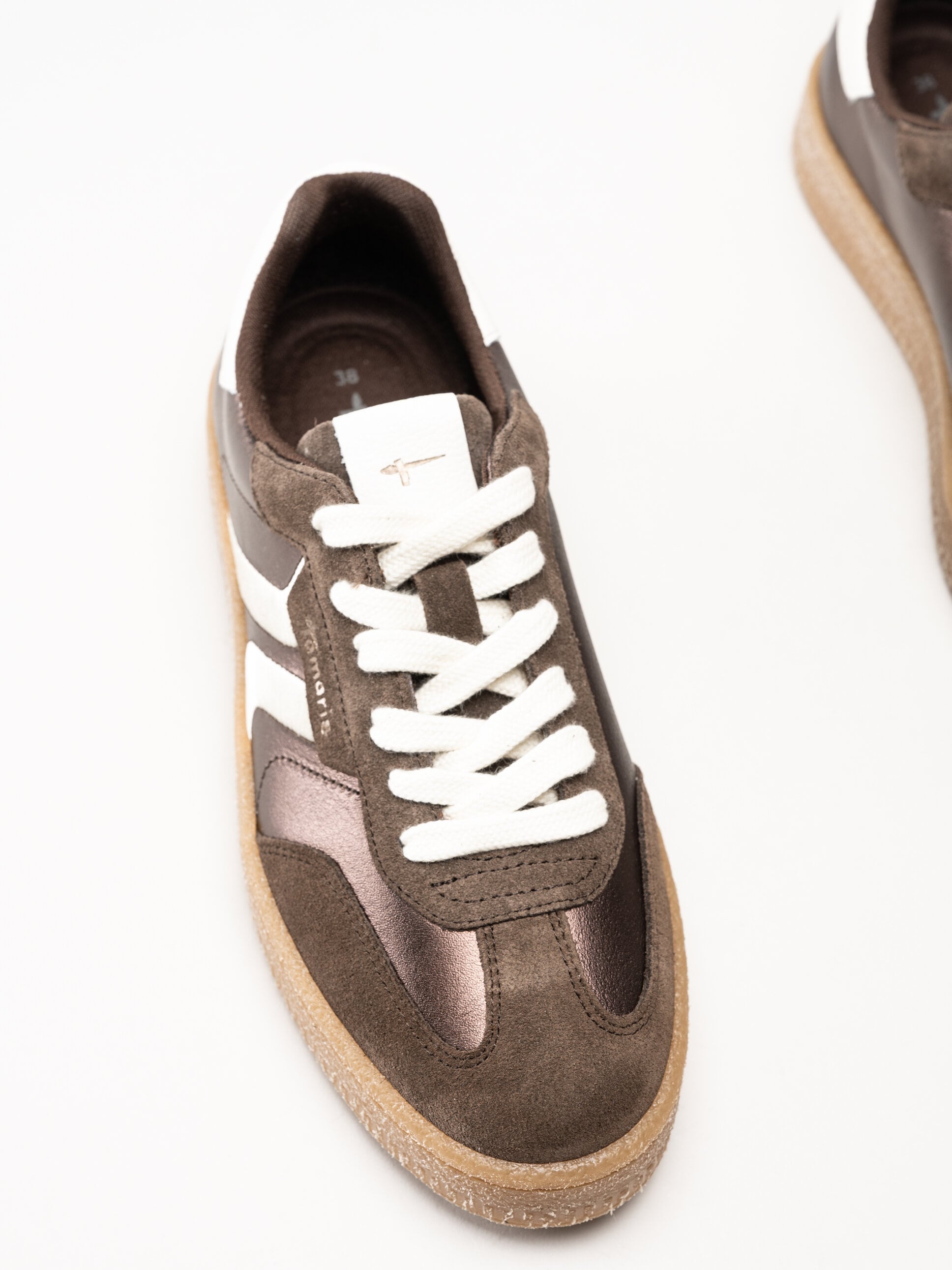 • Tamaris - Mörkbruna sneakers i skinn och mocka