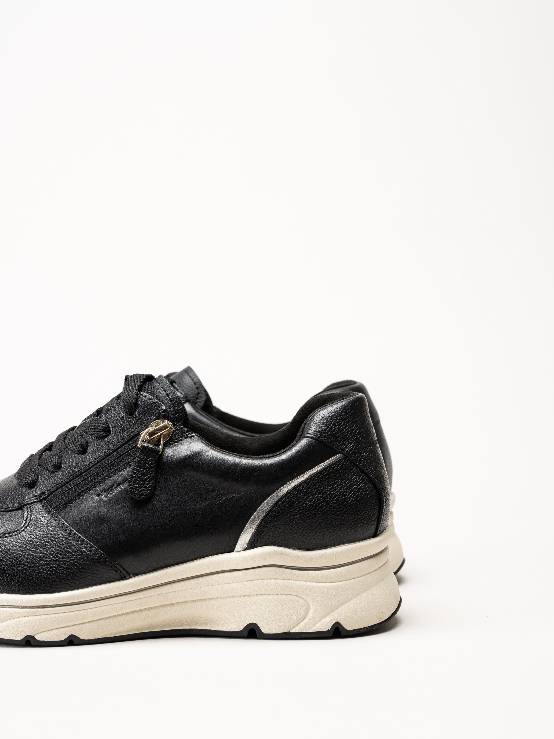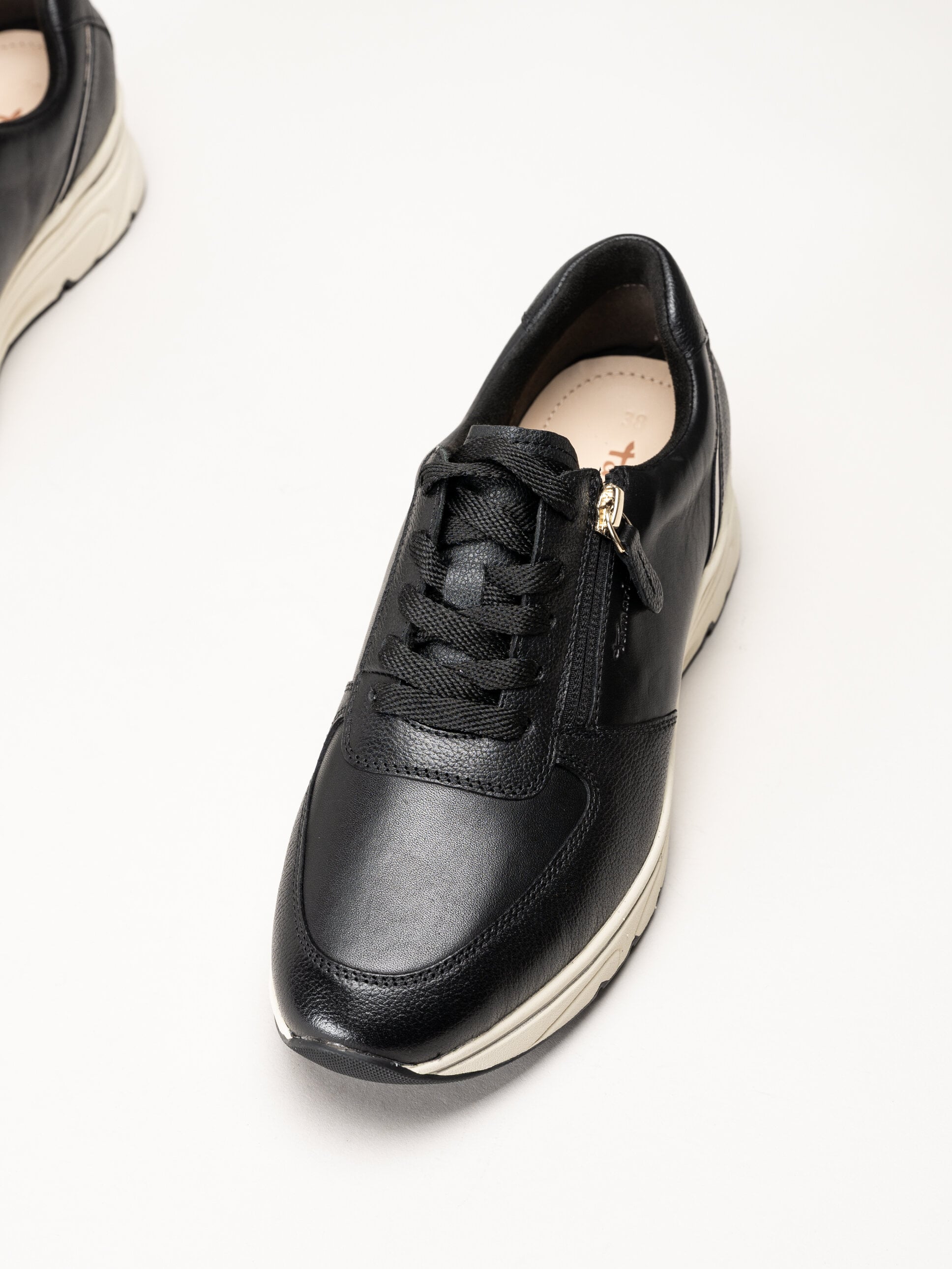 Svarta sneakers i skinn från Tamaris i färgen Black Gold. Skorna är tillverkade i mjukt skinn som ger en följsam och stilren känsla. Den klassiska snörningen framtill gör det enkelt att justera passformen, medan dragkedjan på utsidan gör dem smidiga att ta på och av i vardagen.