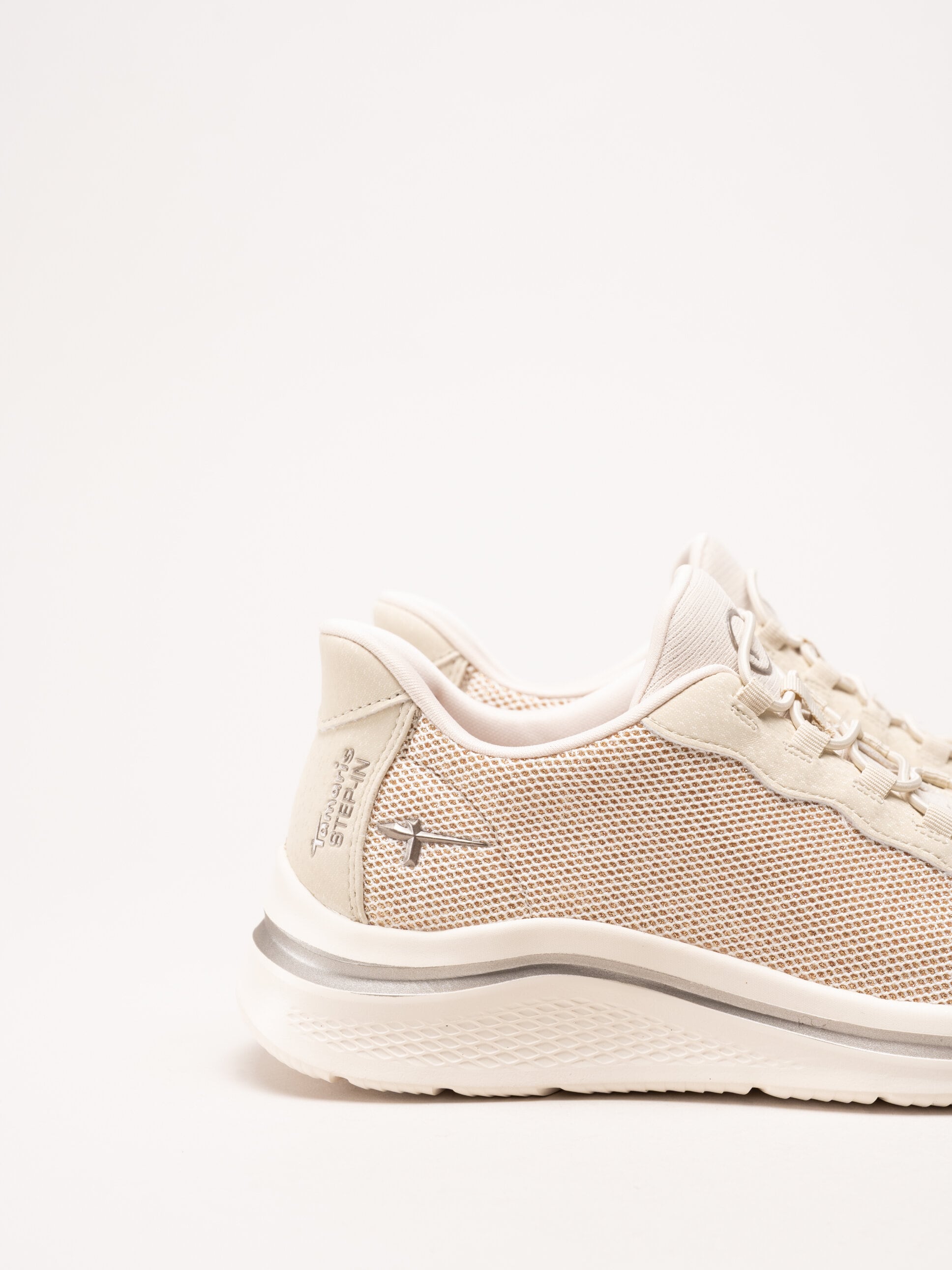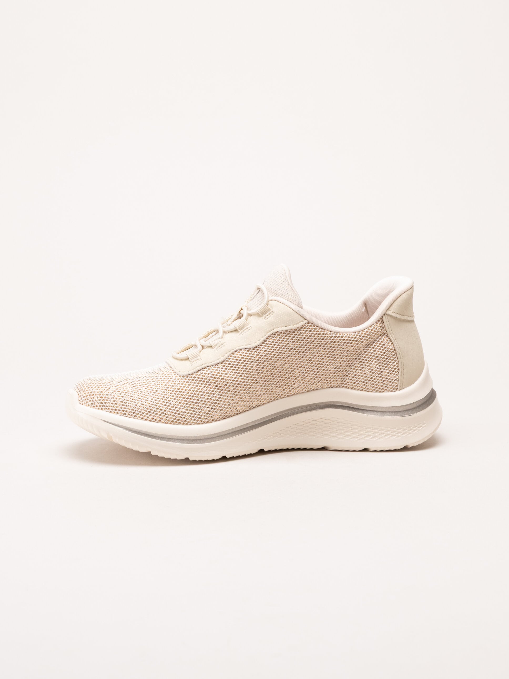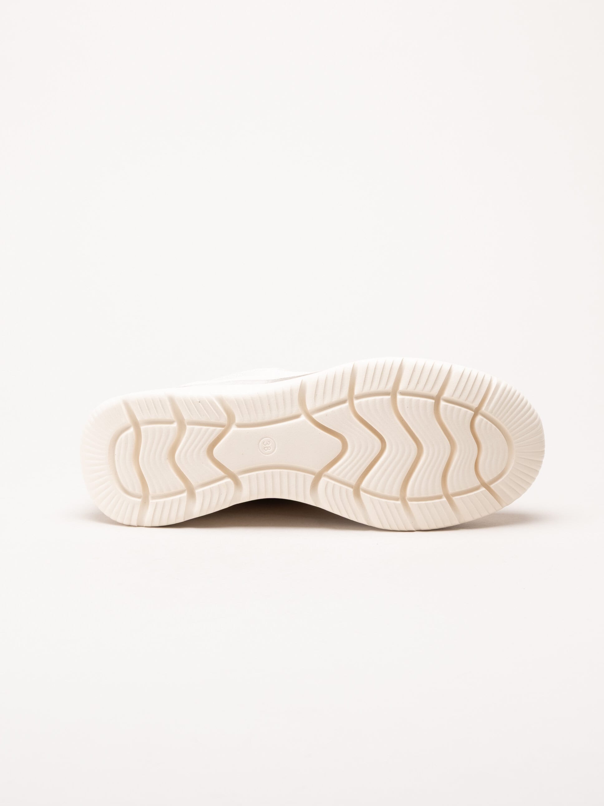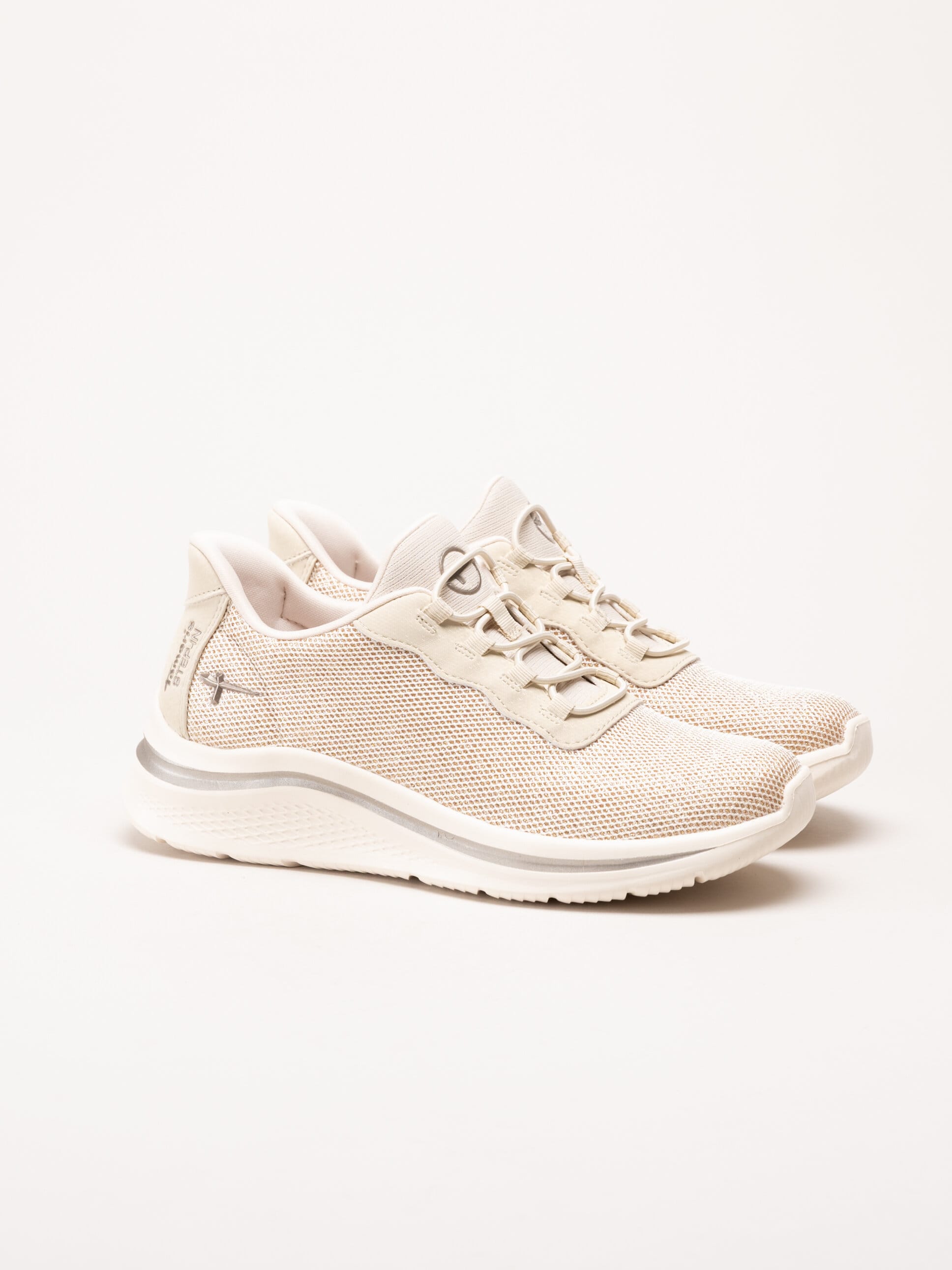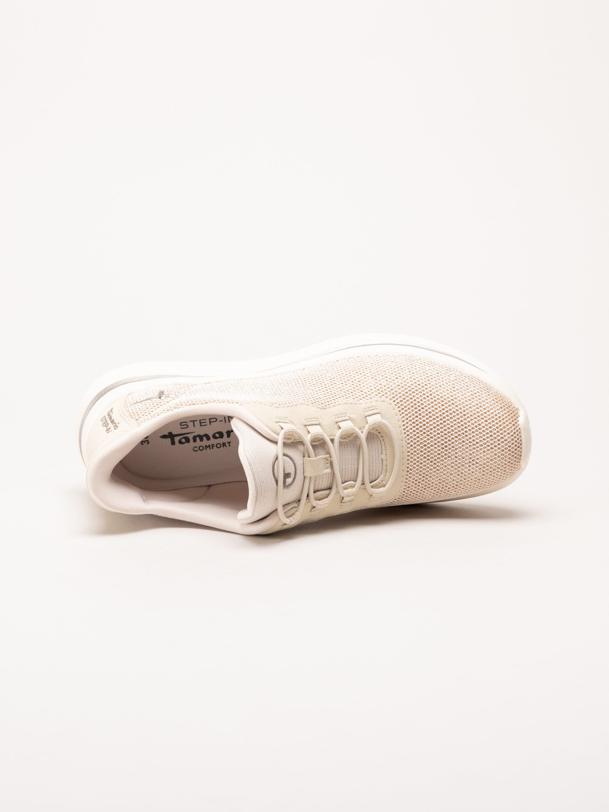 Beige sneakers i textil Wide fit från Tamaris i färgen Ivory med en lätt glittrig finish. Skorna är framställda i lätt och ventilerande textil kombinerat med syntet som ger en följsam och bekväm känsla. Med Tamaris Wide fit erbjuder skorna extra utrymme och en bekväm passform för bredare fötter, och modellen är utrustad med step-In-funktion; det flexibla materialet i bakkappan i kombination med elastiska snören gör skorna extra enkla att ta av och på, utan att kompromissa med komforten. Modellen har H-läst för extra utrymme och komfort.