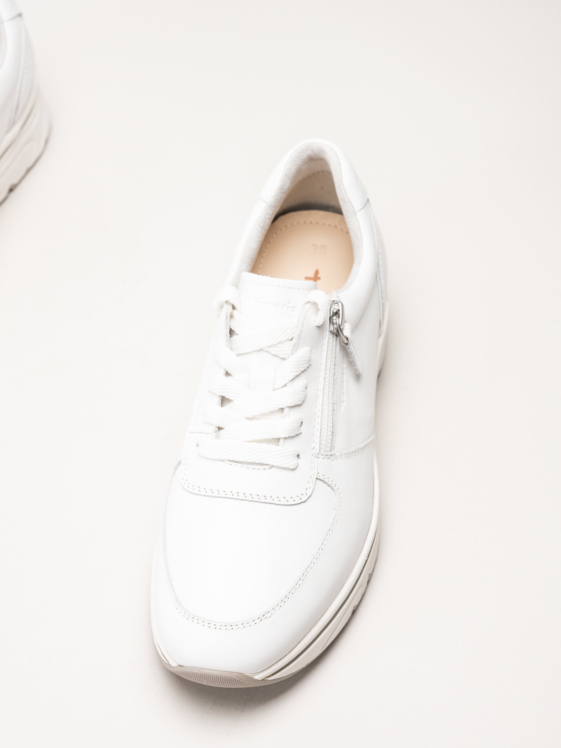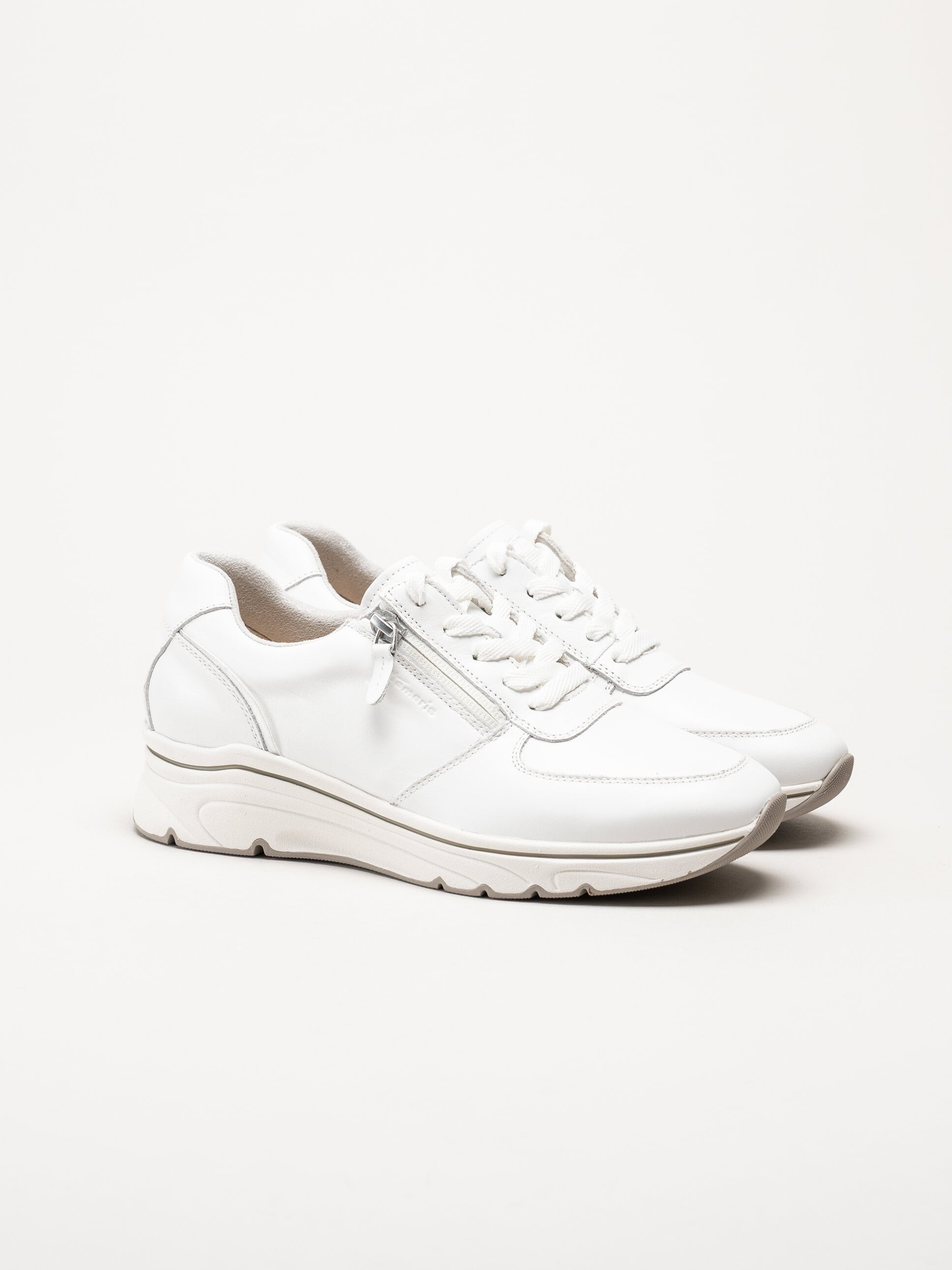 Vita sneakers i skinn från Tamaris. Skorna är tillverkade i mjukt skinn som ger en följsam och stilren känsla. Den klassiska snörningen framtill gör det enkelt att justera passformen, medan dragkedjan på utsidan gör dem smidiga att ta på och av i vardagen.