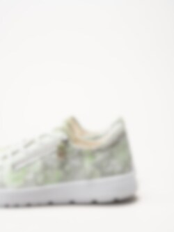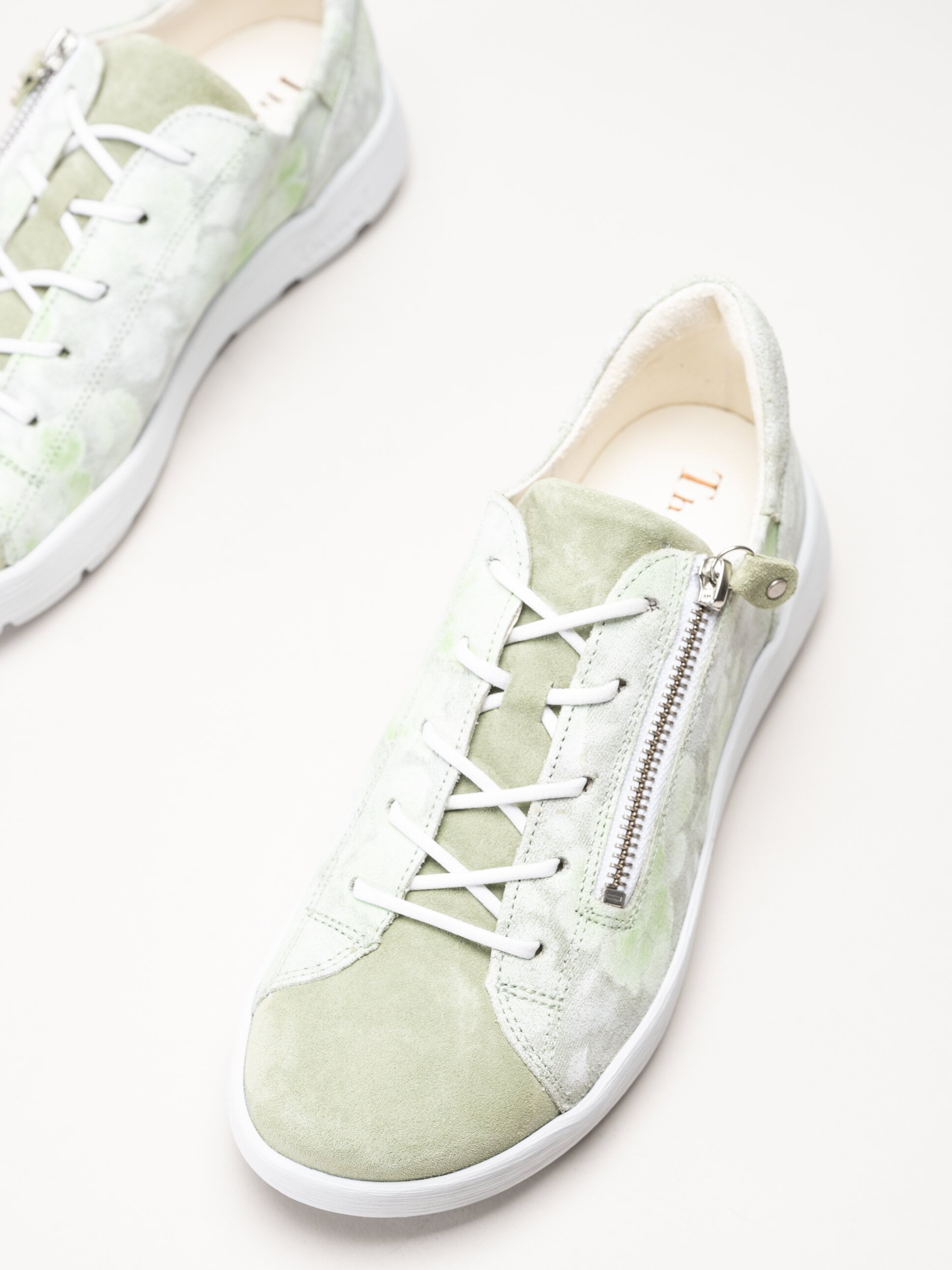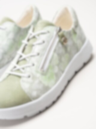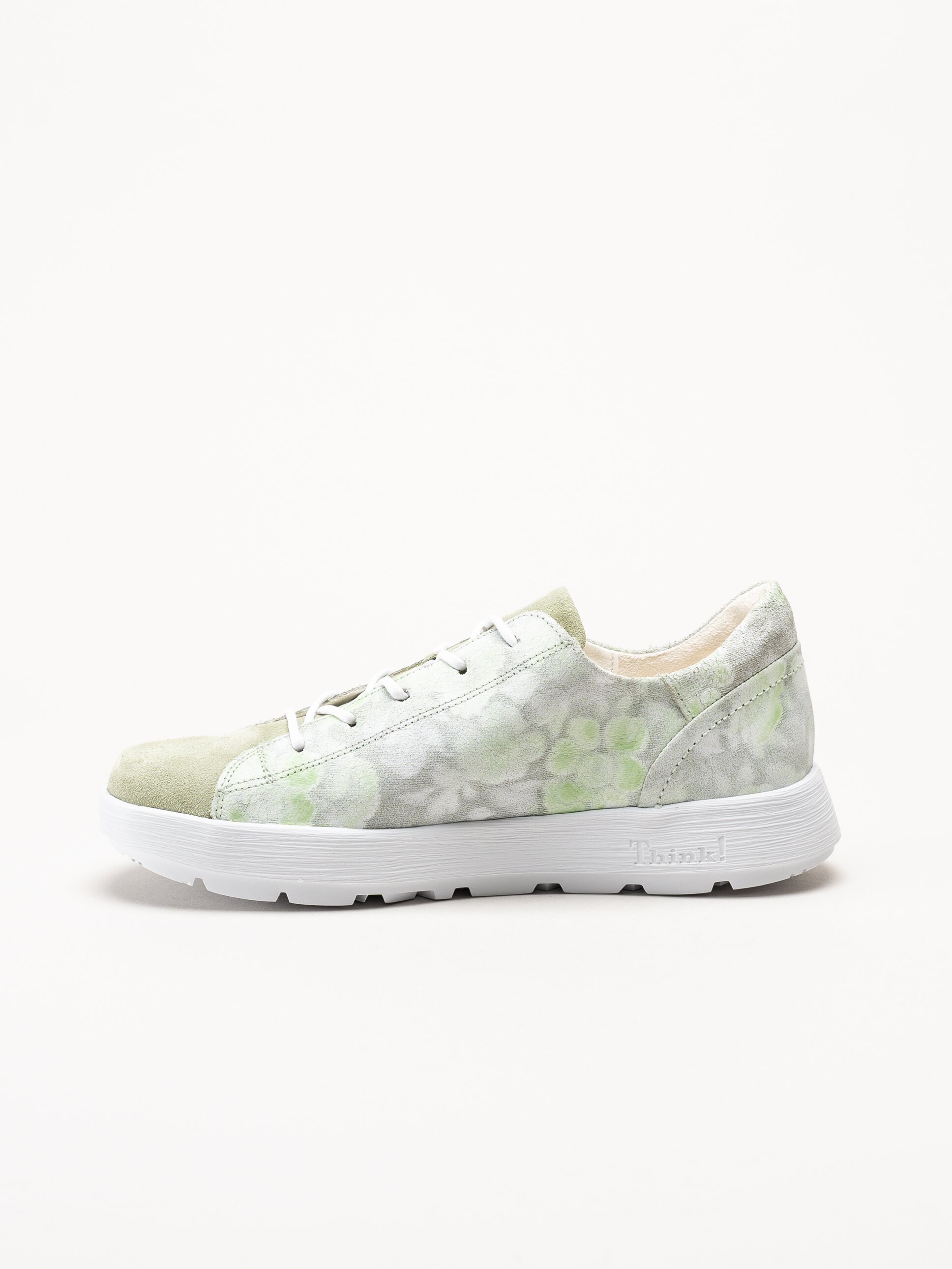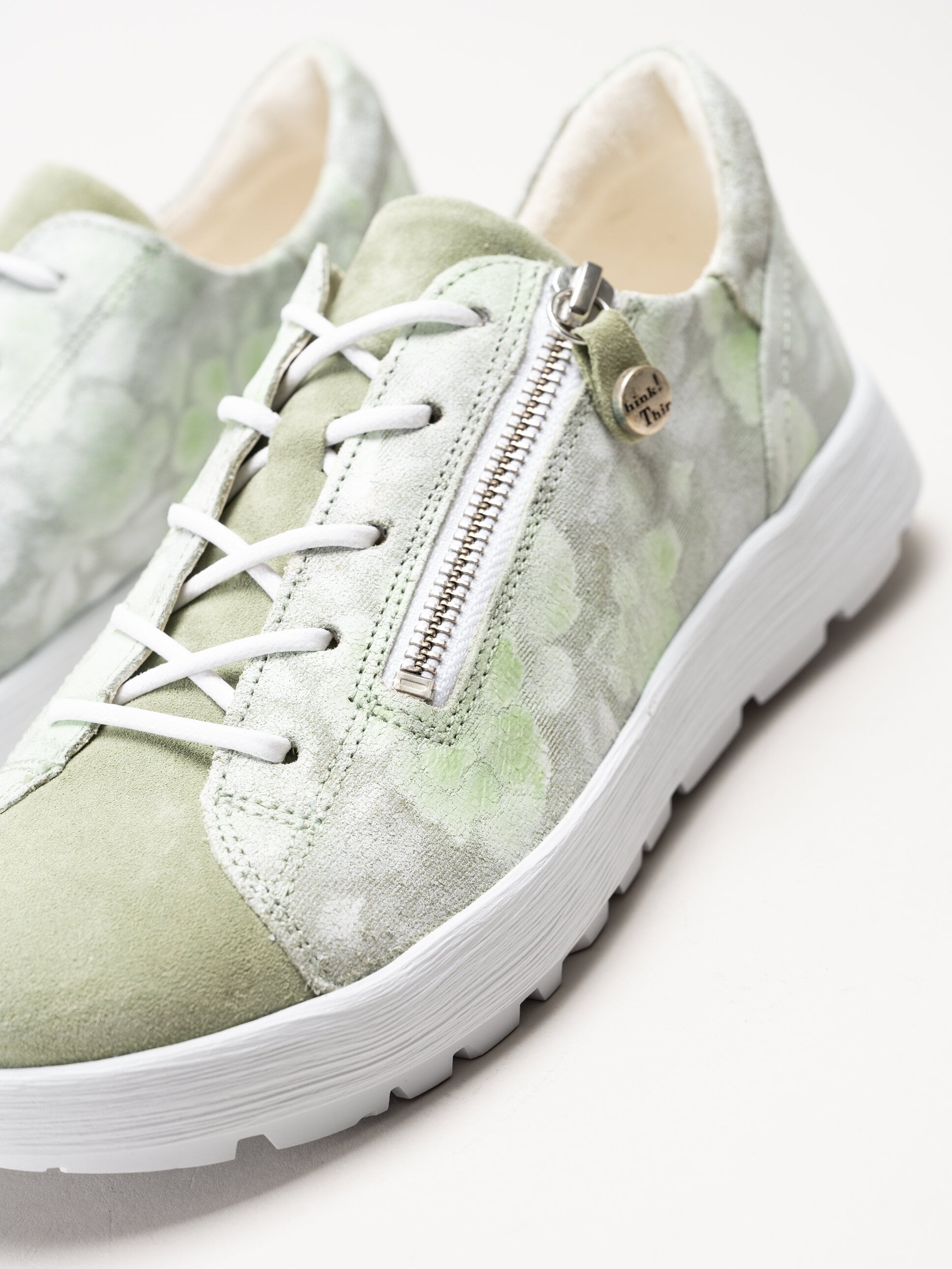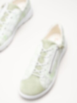 Ljusgröna sneakers i mocka Comoda i färgen Aloe/Kombi från Think!. Skorna är tillverkade i mjuk mocka med en dekorativ ytfinish som skapar ett romantiskt blommönster och ger ett levande och personligt uttryck. Invändigt är modellen fodrade med kromfritt skinn som bidrar till en skön känsla mot foten hela dagen. Den löstagbara innersulan i skinn gör det enkelt att justera komforten eller byta sula vid behov. Kombinationen av snörning och dragkedja på utsidan ger både en stabil passform och smidig av- och påtagning.