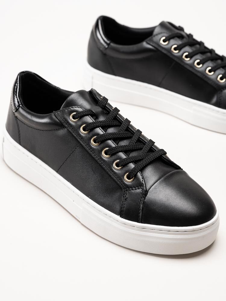 Svarta sneakers i skinn Zoe från Vagabond. Skorna är tillverkade i mjukt skinn som ger ett stilrent och modernt uttryck. Den något högre plattformssulan ger en trendig look samtidigt som den bidrar till extra komfort och stabilitet. De guldfärgade öljetterna ger en elegant detalj som lyfter designen. Invändigt är modellen fodrad med textil, och den löstagbara innersulan i skinn bidrar med mjuk komfort samt möjlighet att använda egna ilägg vid behov.